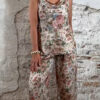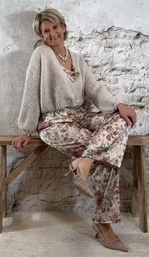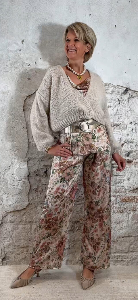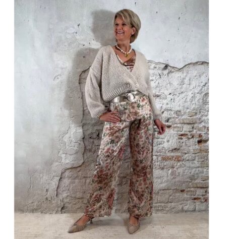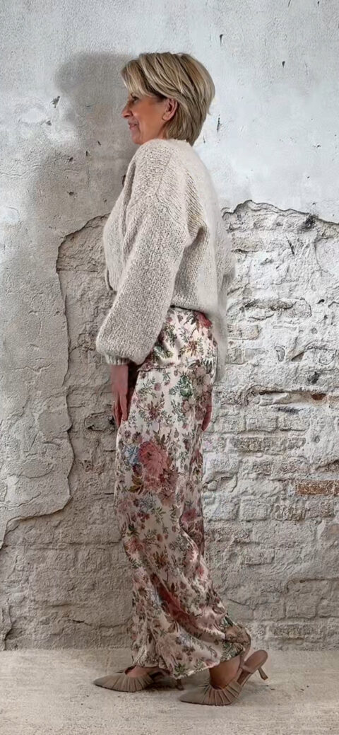 De bloemenprint in beige en groen geeft de broek een rustige maar stijlvolle uitstraling die perfect past bij het voorjaar en de zomer. Door het wijde model beweegt de stof mooi mee tijdens het lopen en voelt de broek luchtig aan.