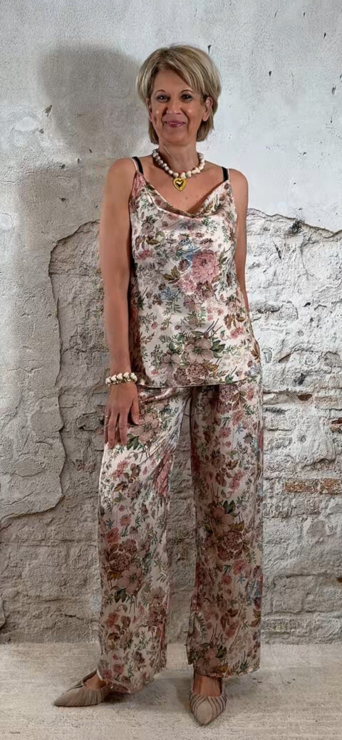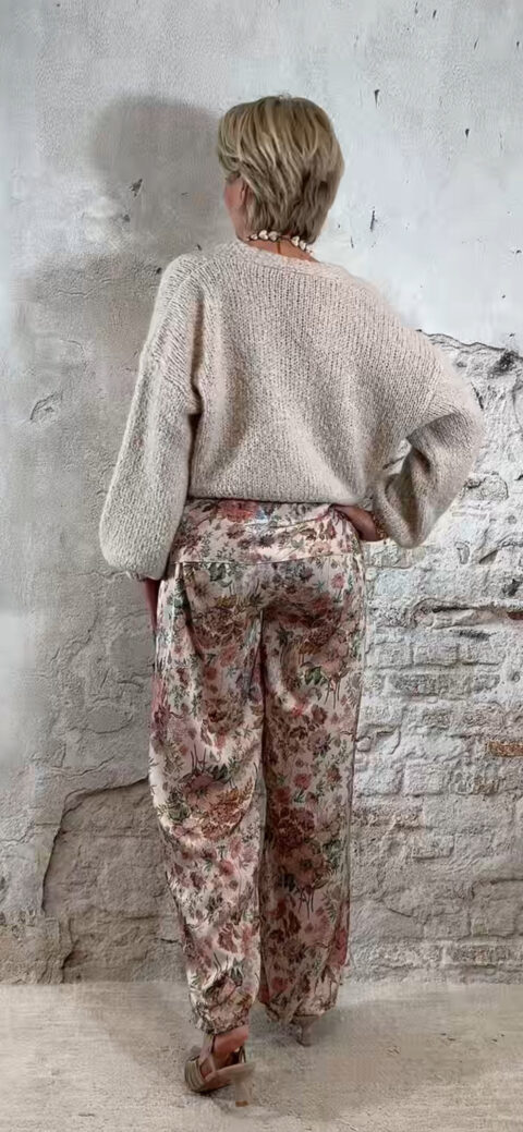 De broek heeft geen zijnaad, waardoor de print mooi doorloopt zonder onderbreking. Dit zorgt voor een rustiger en luxer effect in de stof.