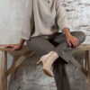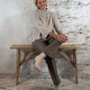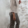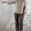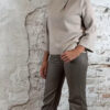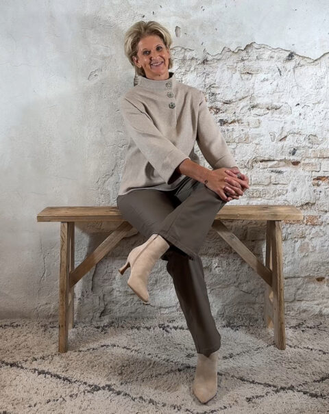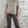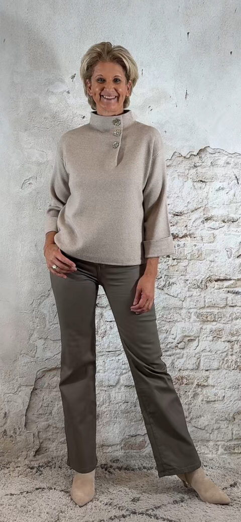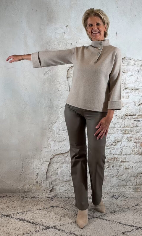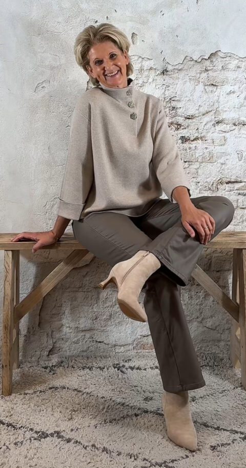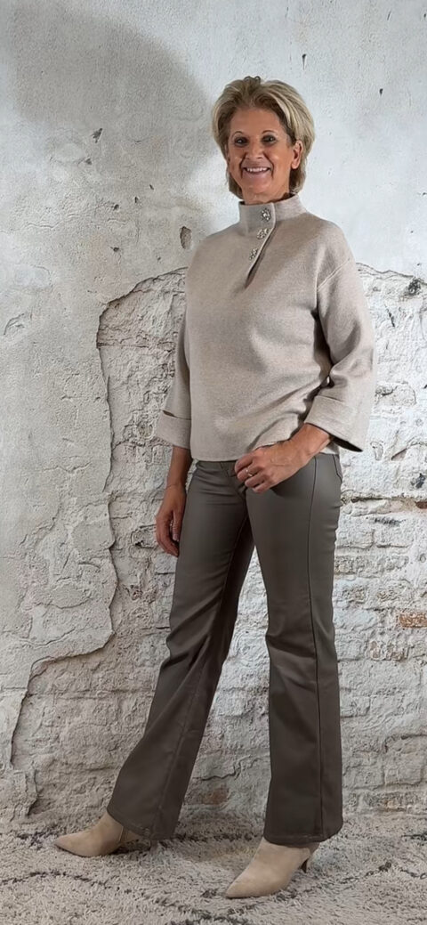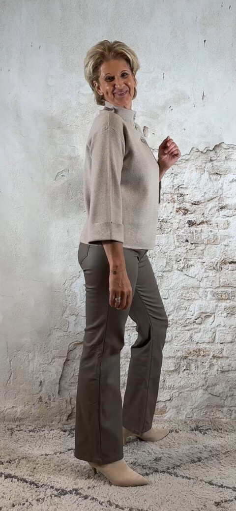 De pullover is hier gecombineerd met de leatherlook bootcut broek in taupe – een perfecte ton-sur-ton look.