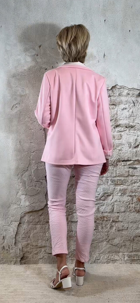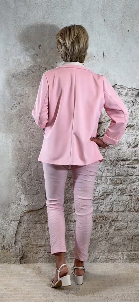 De blazer is gevoerd met een subtiel glanzende voering, wat zorgt voor een nette en verzorgde afwerking. Het model heeft een klassieke reverskraag en sluit met één roze knoop in het midden. Aan de voorkant zitten klepjes en een nep paspelzakje, wat zorgt voor een elegante blazer-look zonder dat het model zwaar oogt.