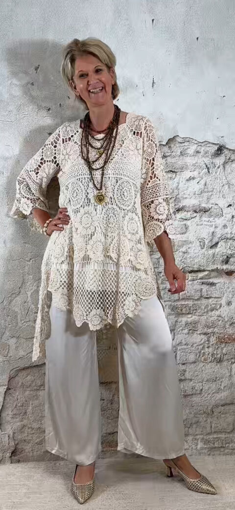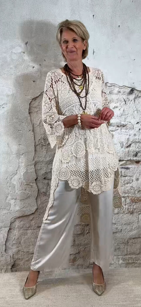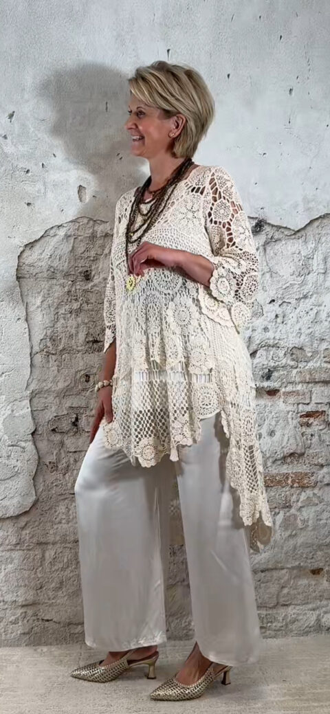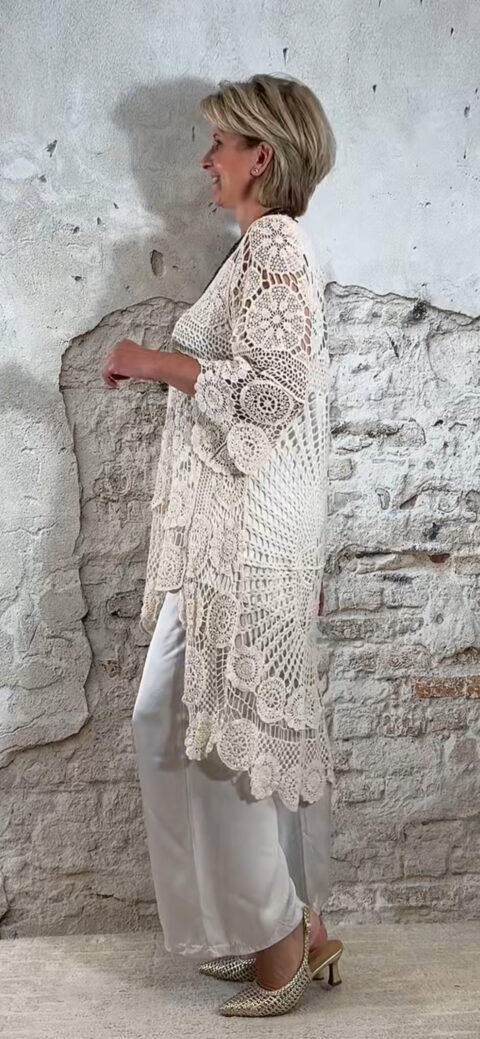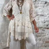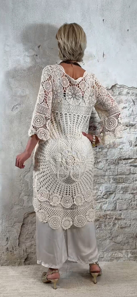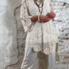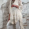De Floor gehaakte jurk in ecru is een opvallende en luchtige tuniek met een prachtig opengewerkt haakpatroon. De jurk bestaat uit verschillende gehaakte structuren die samen zorgen voor een speels en bohemian effect.