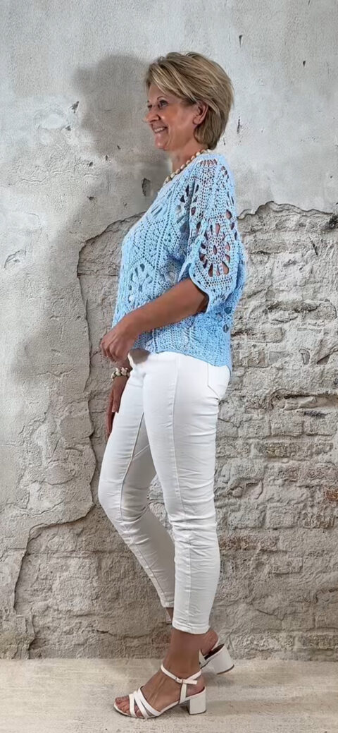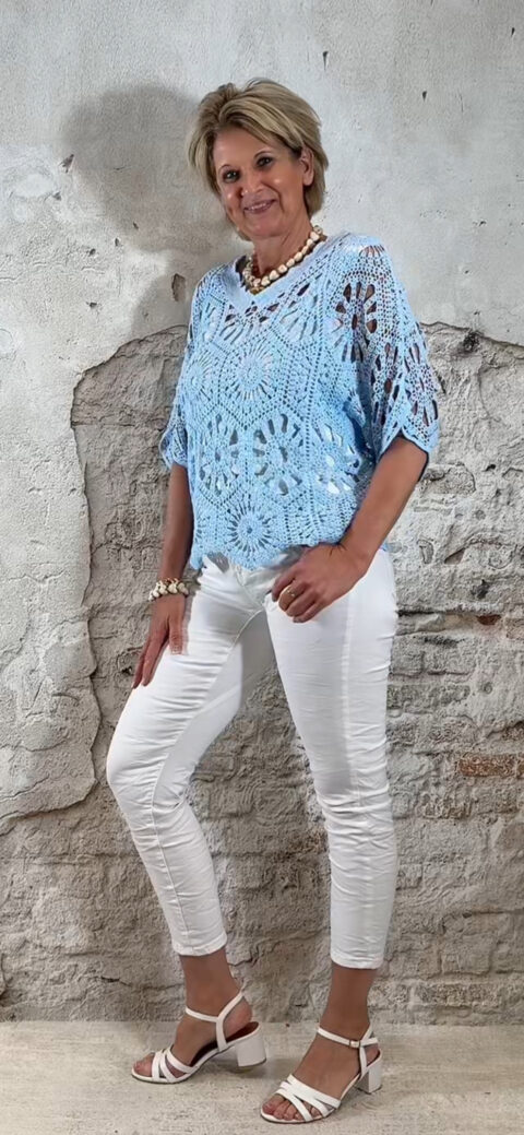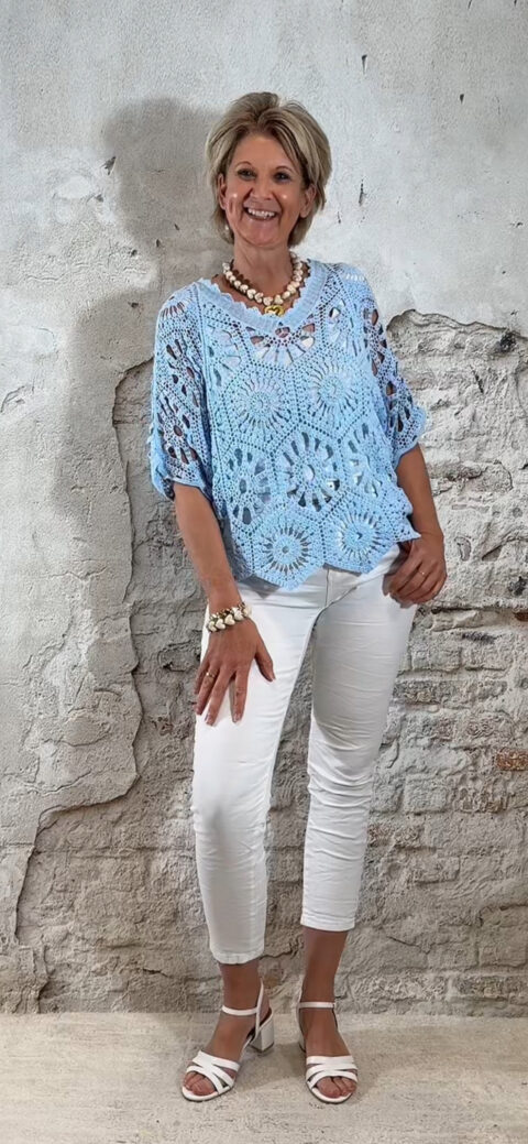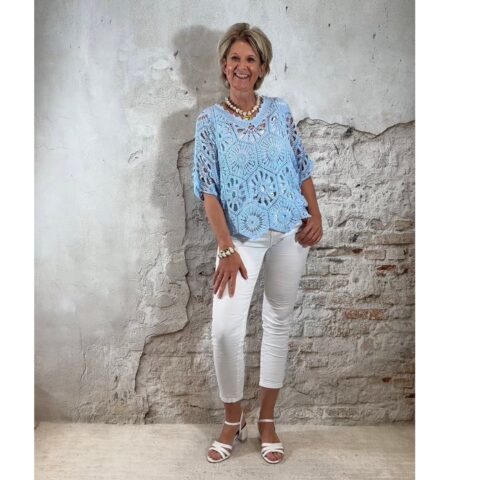 De Floor gehaakte vlindertop is luchtig, vrouwelijk en perfect voor zonnige dagen. Het vlindermodel valt soepel en geeft een speels silhouet dat mooi meebeweegt. De open gehaakte structuur zorgt voor een zomerse en elegante uitstraling.