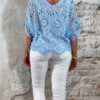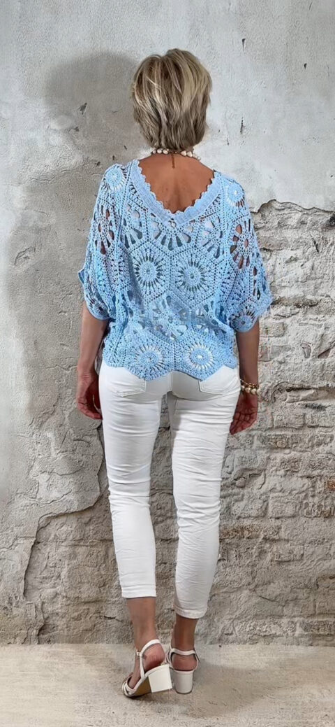 De top heeft een V-hals met een subtiel schulp randje voor een verfijnde afwerking. Ook aan de achterkant is een V-hals verwerkt, wat zorgt voor een elegante en open look. De mouwen vallen tot aan de elleboog en het gehaakte patroon geeft de top een luchtige, handgemaakte uitstraling.