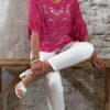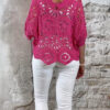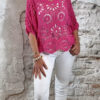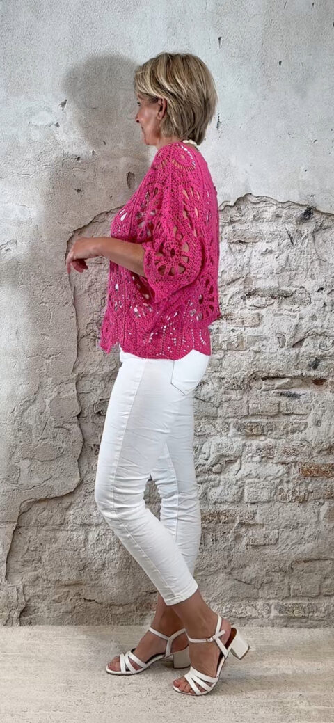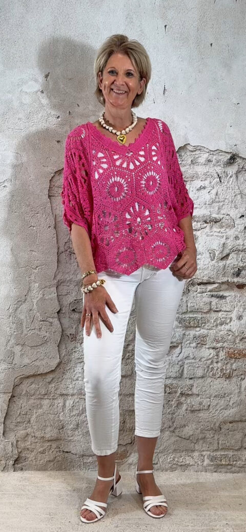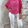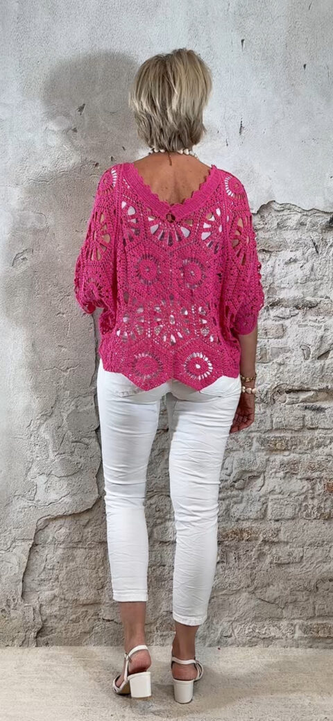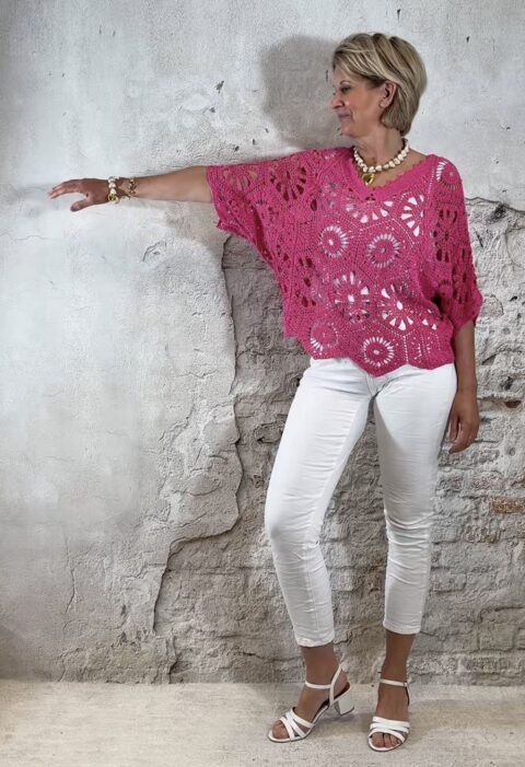 De top heeft een V-hals met een subtiel schulp randje voor een verfijnde afwerking. Ook aan de achterkant is een V-hals verwerkt, wat zorgt voor een elegante en open look. De mouwen vallen tot aan de elleboog en het gehaakte patroon geeft de top een luchtige, handgemaakte uitstraling.