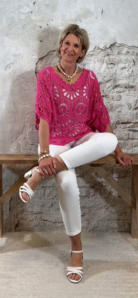 De Floor gehaakte vlindertop is luchtig, vrouwelijk en perfect voor zonnige dagen. Het vlindermodel valt soepel en geeft een speels silhouet dat mooi meebeweegt. De open gehaakte structuur zorgt voor een zomerse en elegante uitstraling.