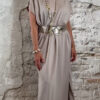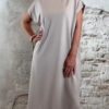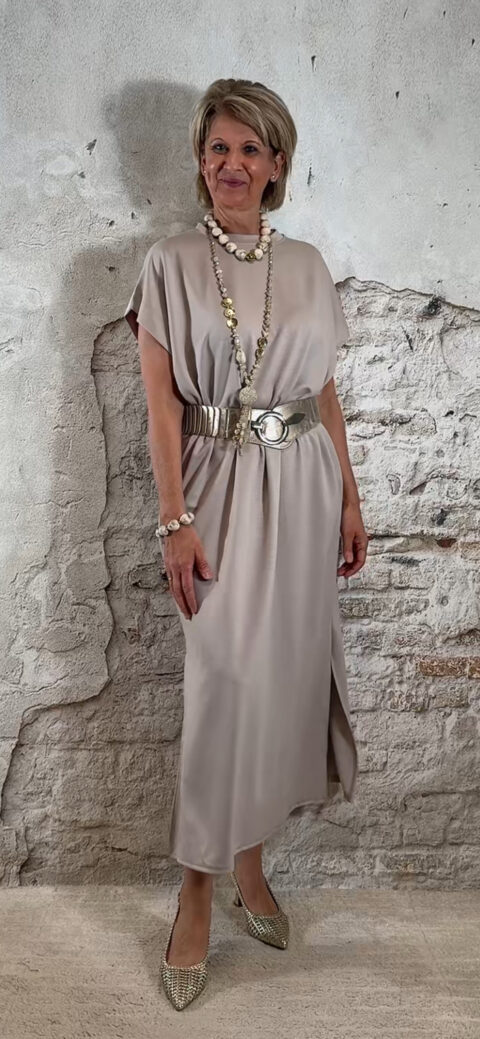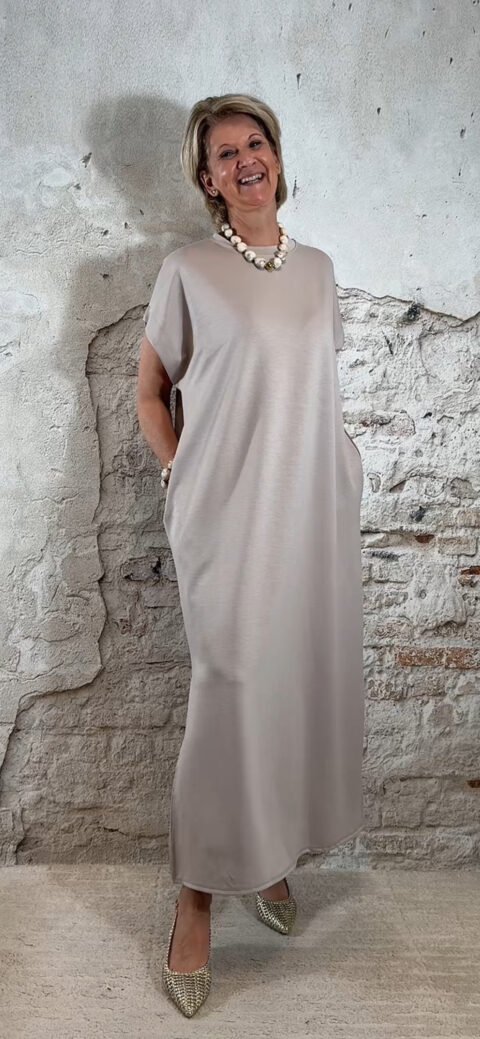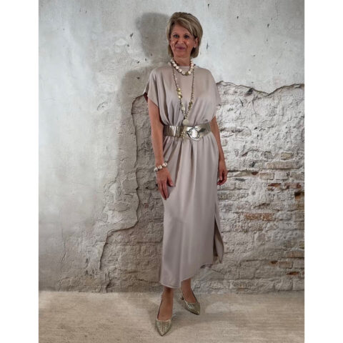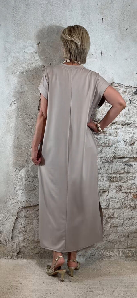 De jurk heeft een ronde hals en kapmouwen, wat zorgt voor een casual en vrouwelijke look. Aan de zijkanten zitten splitten, waardoor de jurk soepel valt en mooi meebeweegt.