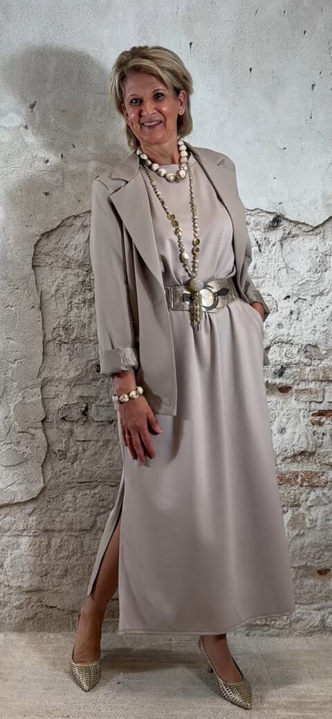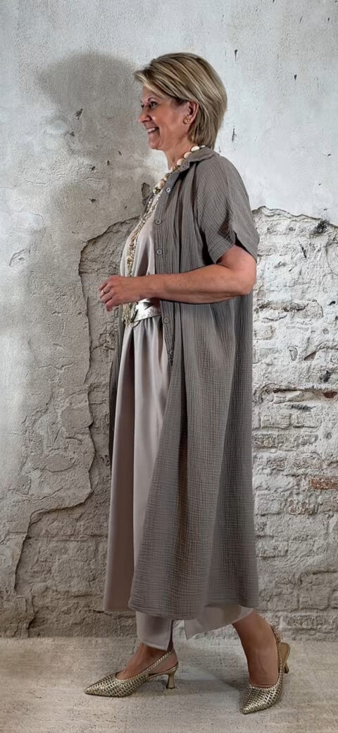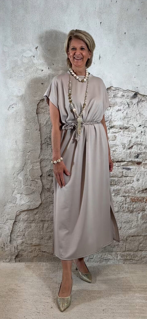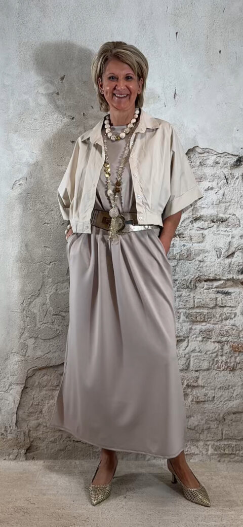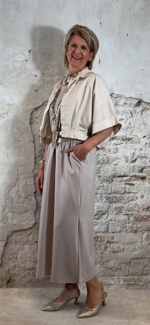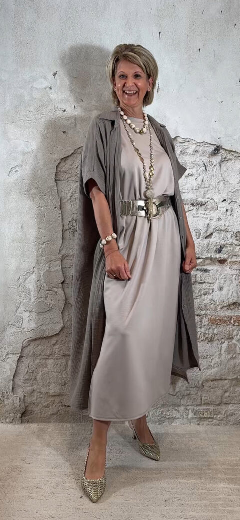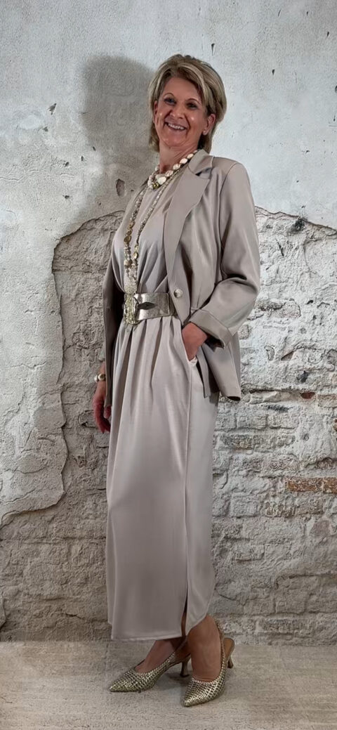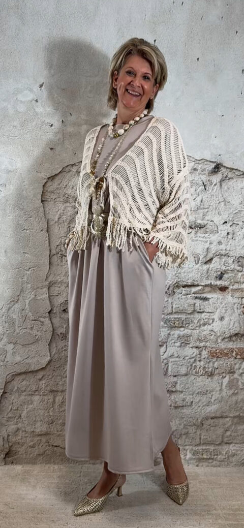 Het leuke aan deze jurk is dat je hem op heel veel manieren kunt combineren en stylen. Denk aan een blazer, gehaakt vest, kort blouse jasje of een lang linnen vest. Met sieraden zoals lange kettingen maak je de outfit helemaal af.