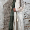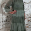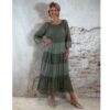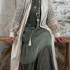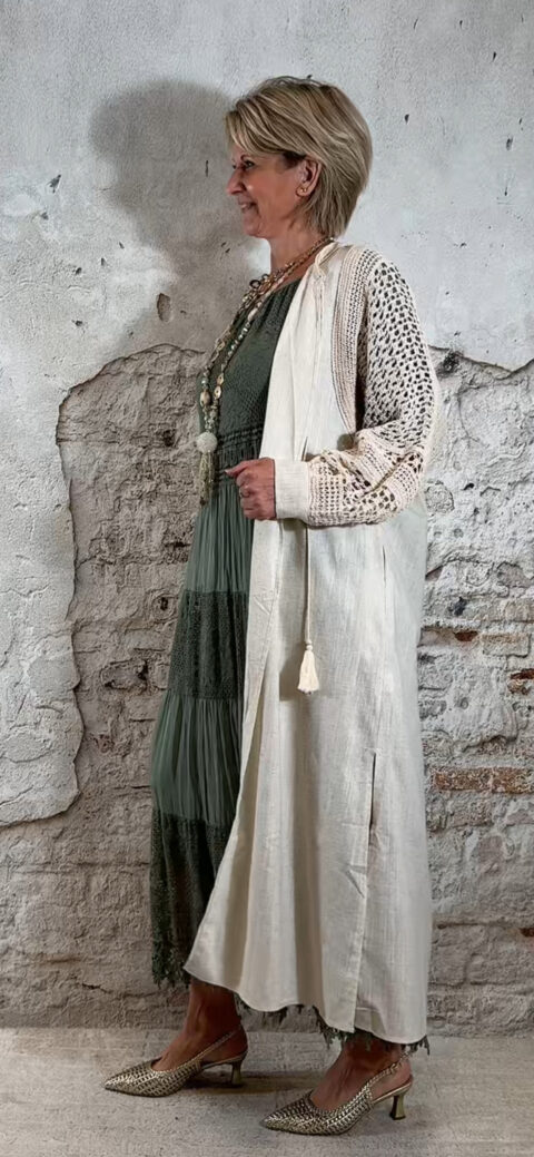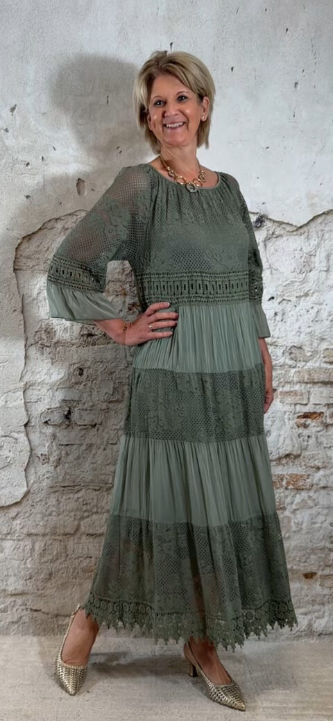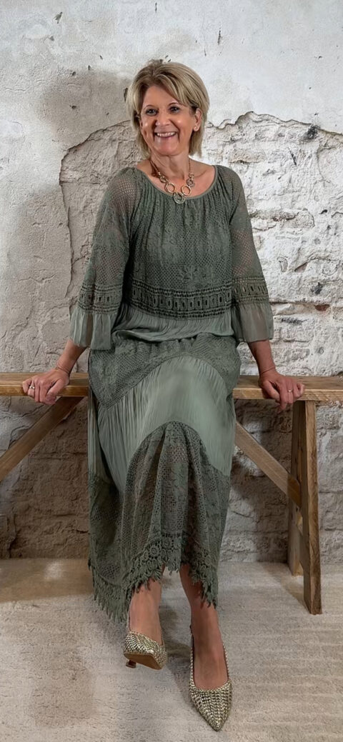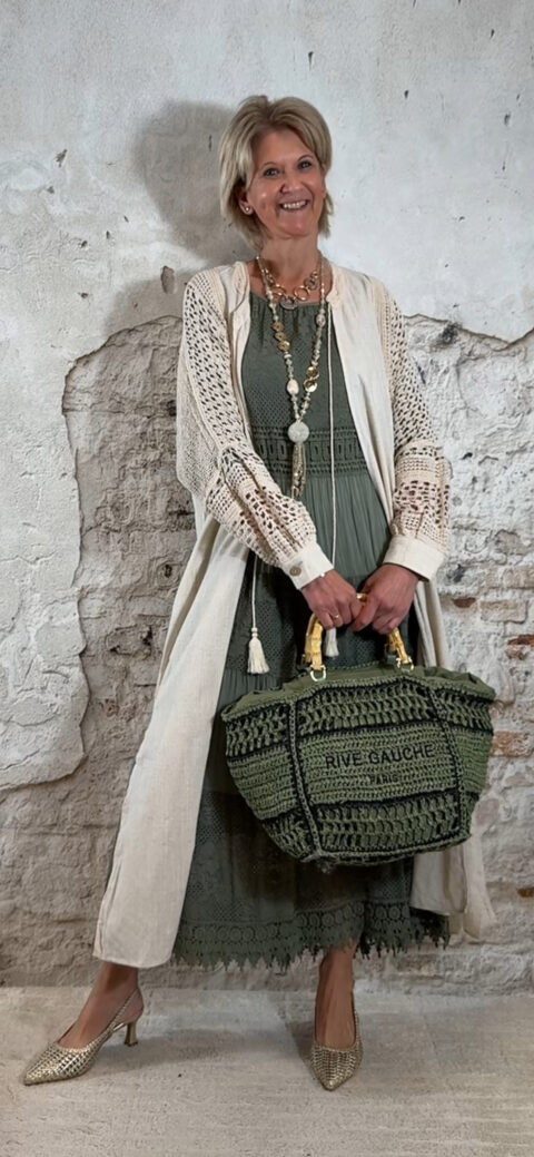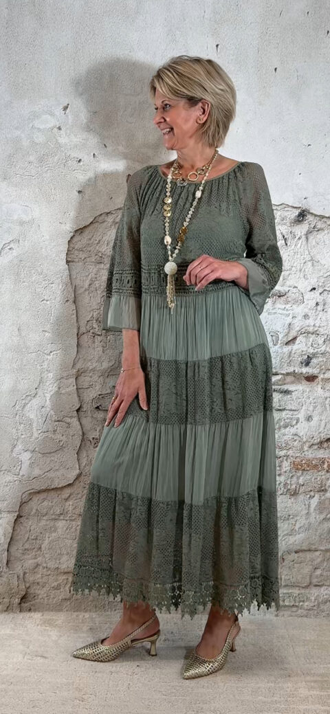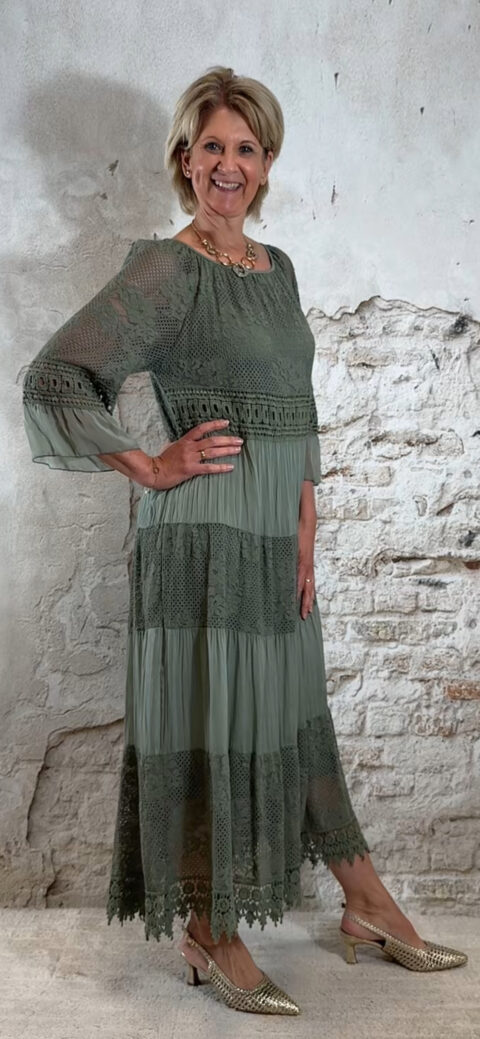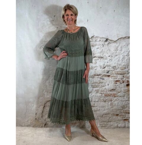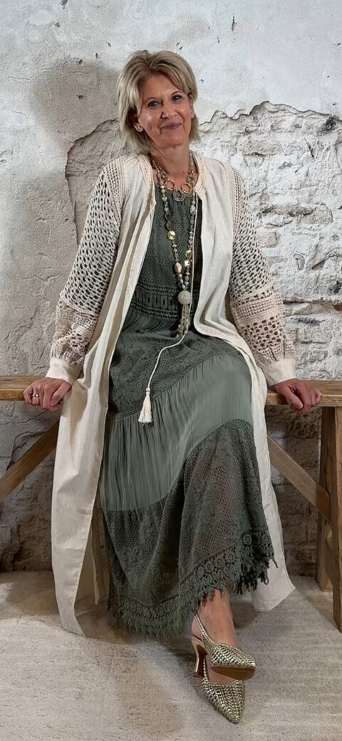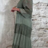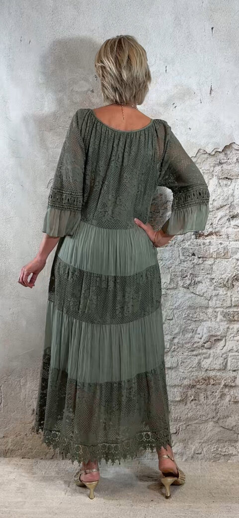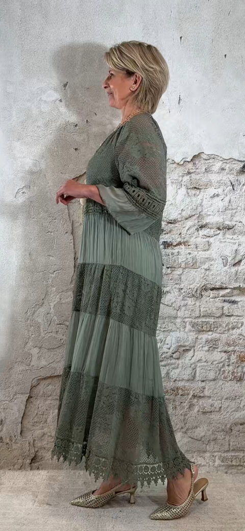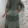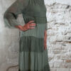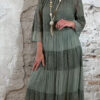 Het model heeft een ronde halslijn en 3/4 flare mouwen die soepel meebewegen. De lange maxi lengte geeft de jurk een elegante, vrouwelijke look die perfect past binnen een Ibiza stijl outfit. Door de zachte khaki kleur is deze jurk makkelijk te combineren met natuurlijke tinten en accessoires.