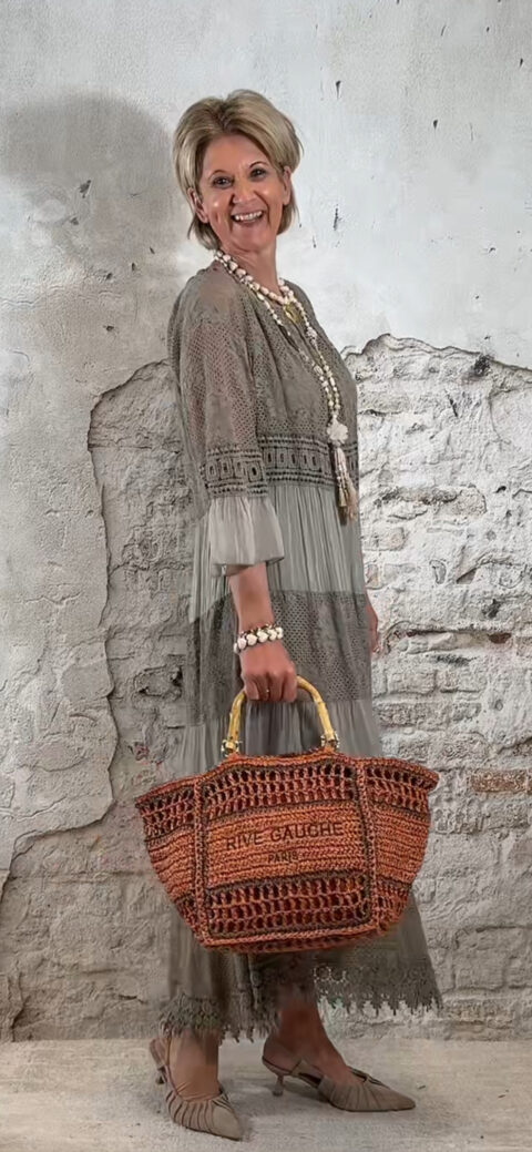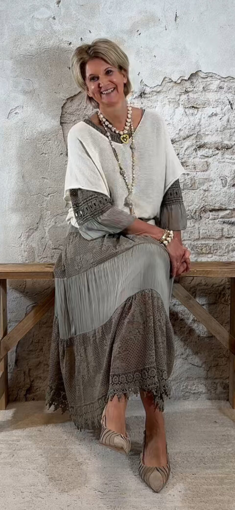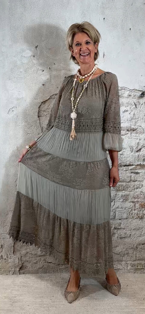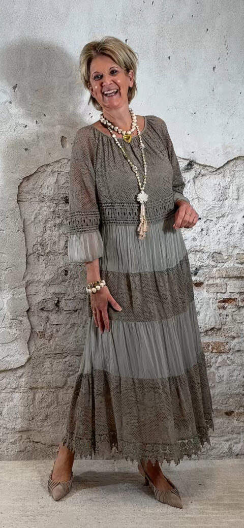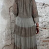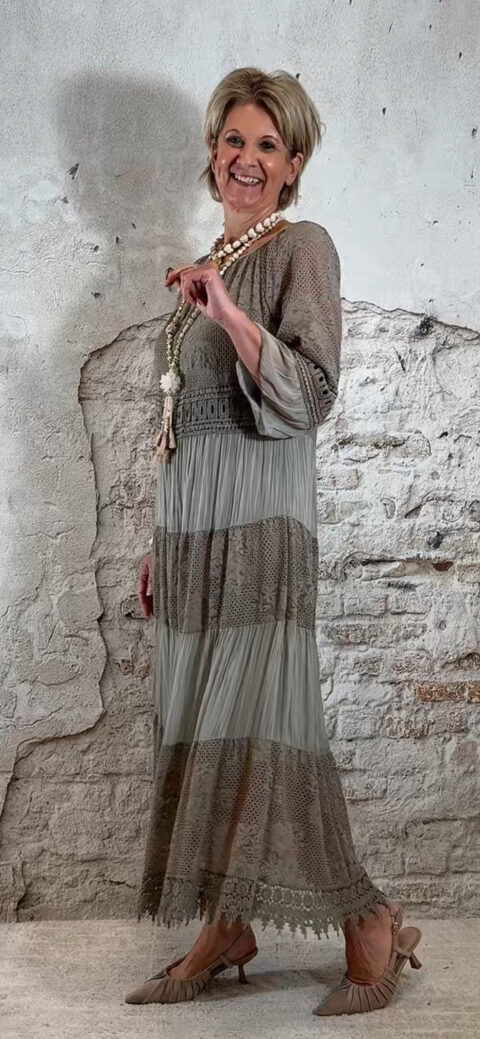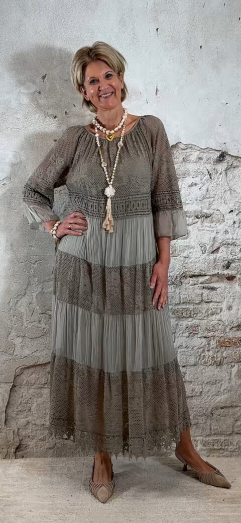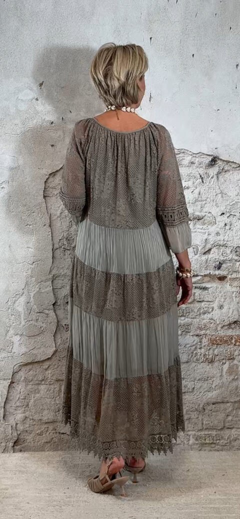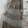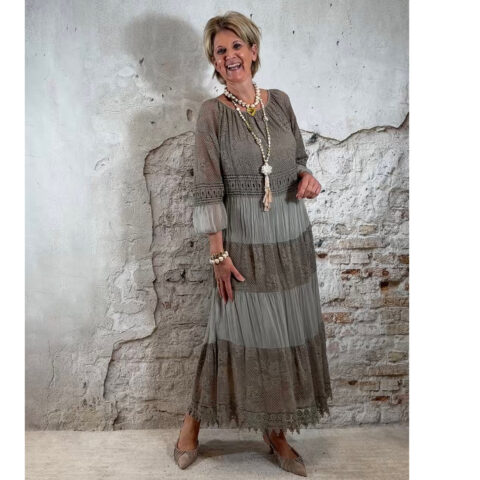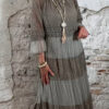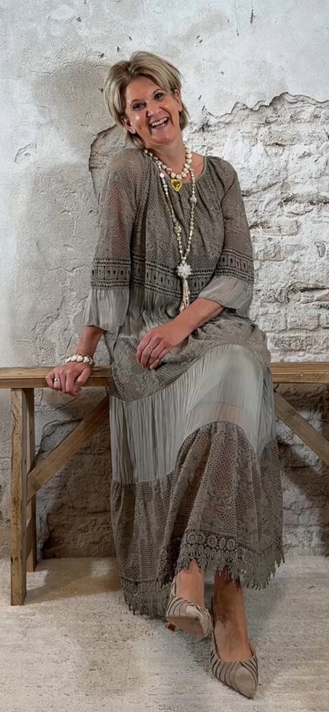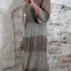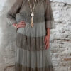 Het model heeft een ronde halslijn en 3/4 flare mouwen die soepel meebewegen. De lange maxi lengte geeft de jurk een elegante, vrouwelijke look die perfect past binnen een Ibiza stijl outfit. Door de zachte kleur taupe is deze jurk makkelijk te combineren met natuurlijke tinten en accessoires.
