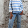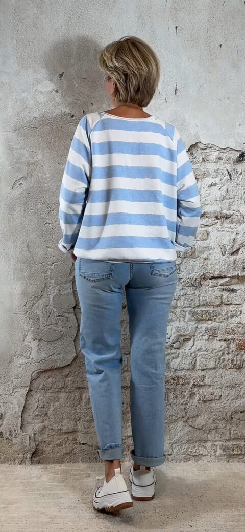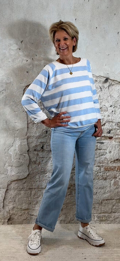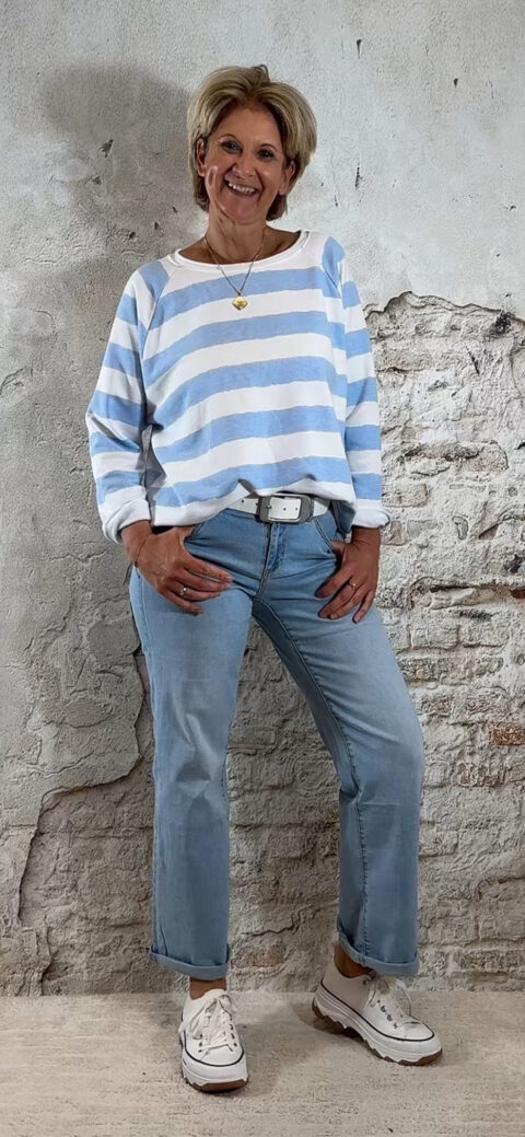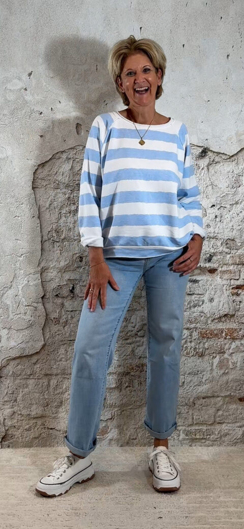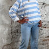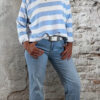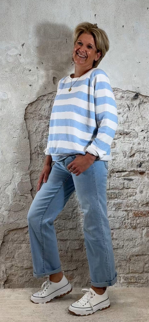 De Floor stripe sweater in light blue is een casual, zomerse sweater met een frisse wit-lichtblauwe streep en comfortabele joggingstof.