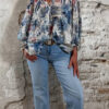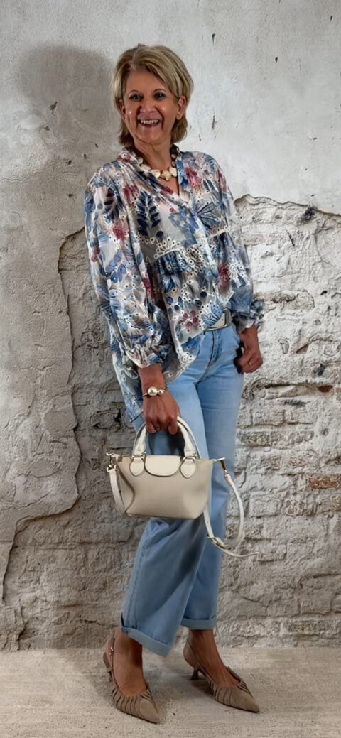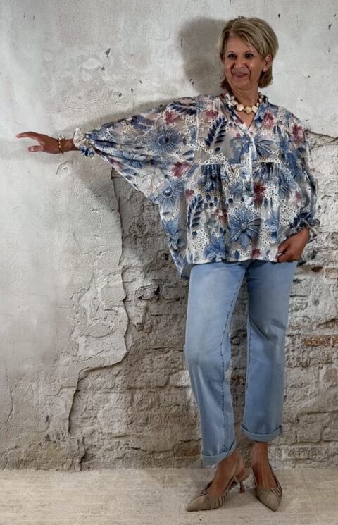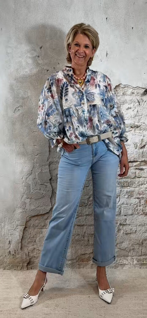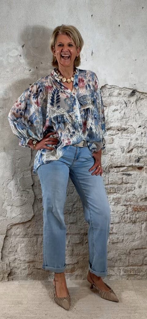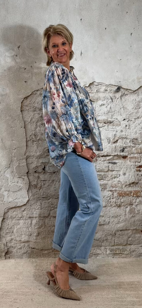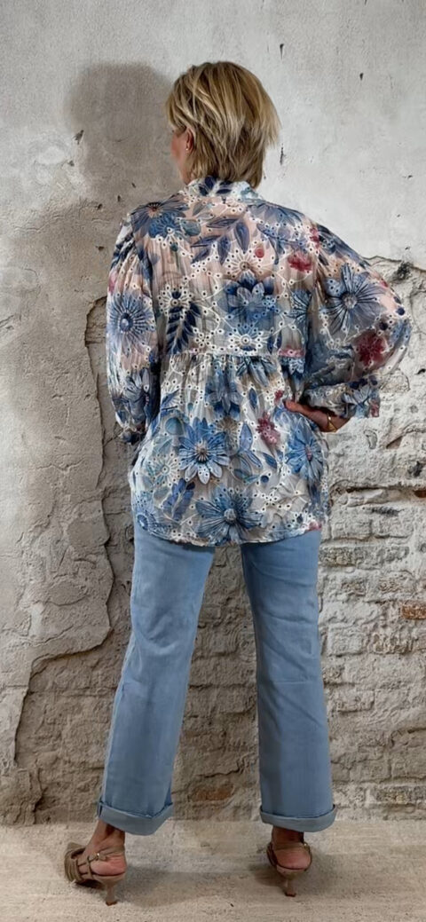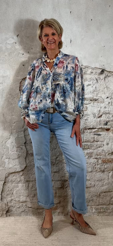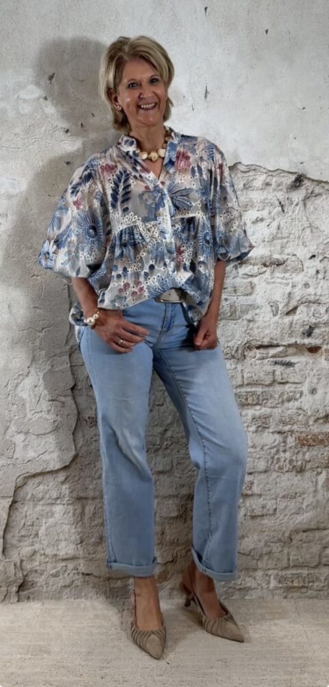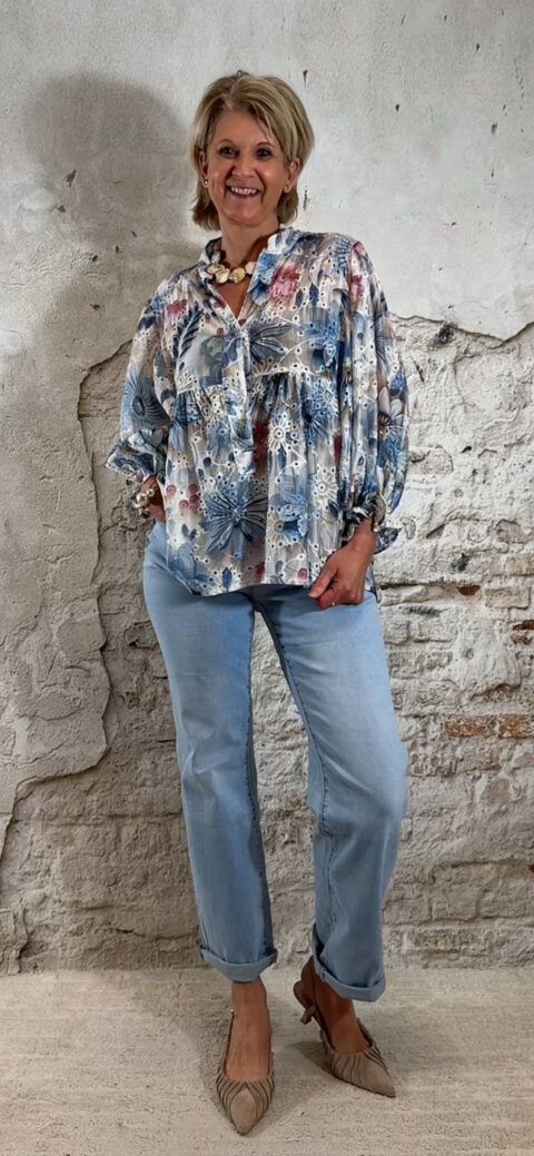 De jeansblauwe bloemen print zorgt voor een frisse uitstraling en maakt deze blouse ideaal om te combineren met een jeans voor een ton-sur-ton look, maar ook prachtig met wit of beige.