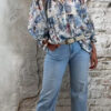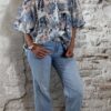 Deze ibiza blouse voor dames in een frisse jeansblauwe bloemen print is een perfecte combinatie van vrouwelijk en casual. De blouse valt heerlijk wijd en luchtig en heeft een speels, nonchalant effect door het aangerimpelde pasje aan de voor- en achterkant.