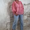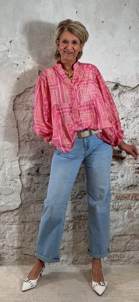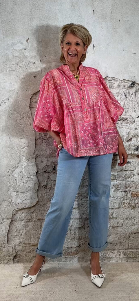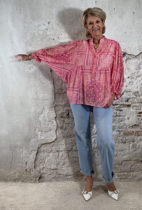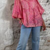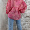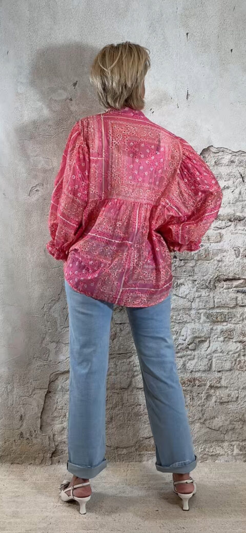 Deze ibiza blouse voor dames in een opvallende pink paisley print is dé eyecatcher voor jouw zomergarderobe. De blouse valt heerlijk wijd en luchtig en heeft een speels, nonchalant effect door het aangerimpelde pasje aan de voor- en achterkant.