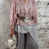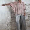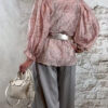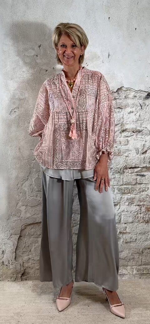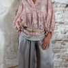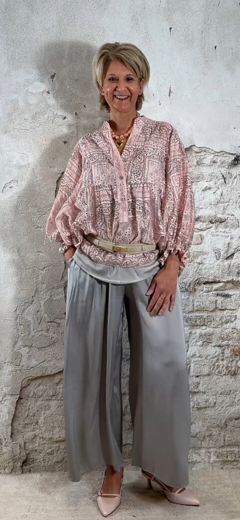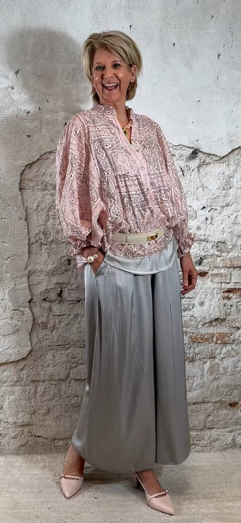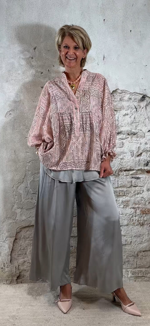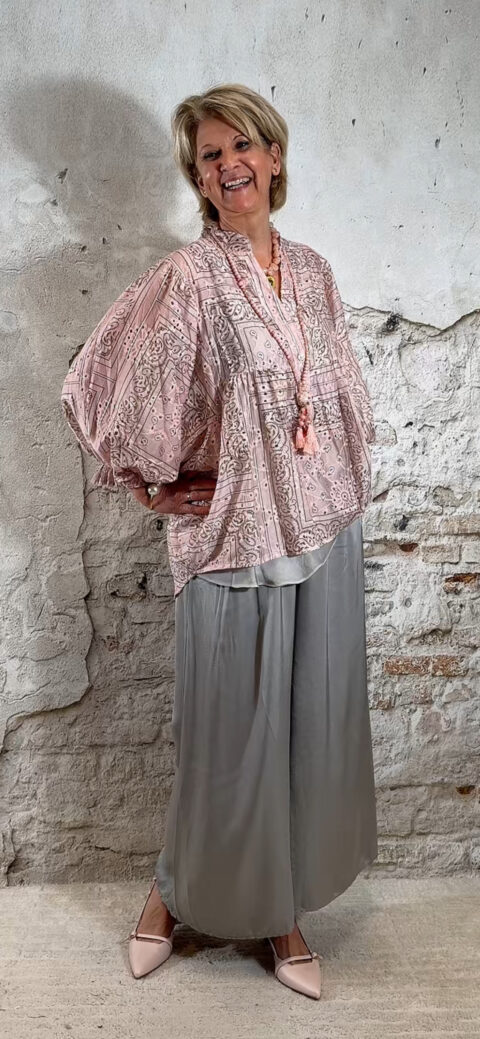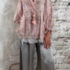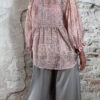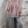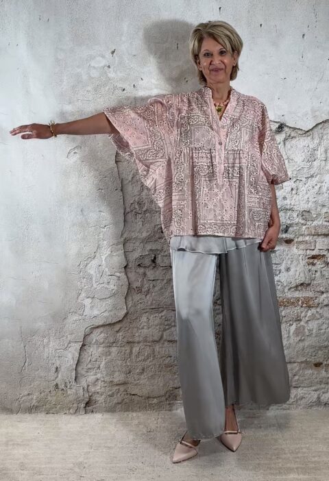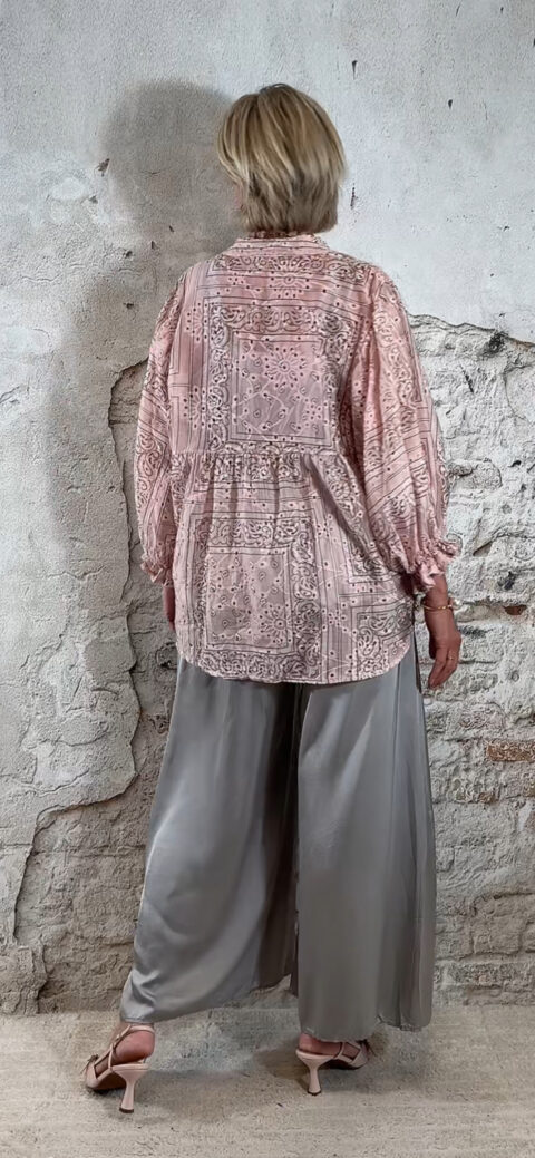 Deze ibiza blouse voor dames in een zachte lichtroze paisley print is echt zo’n item waar je meteen blij van wordt. De blouse valt heerlijk wijd en luchtig en heeft een speels, nonchalant effect door het aangerimpelde pasje aan de voor- en achterkant.