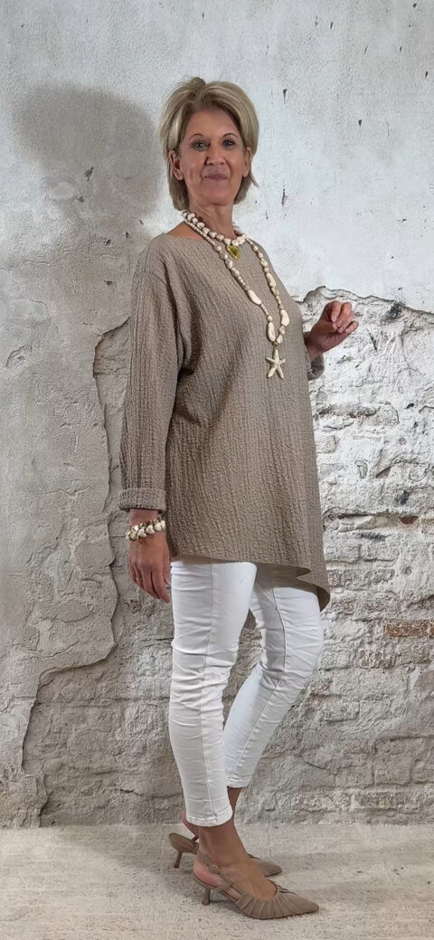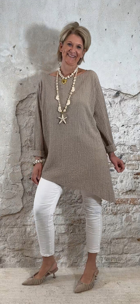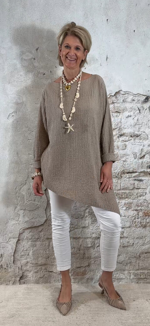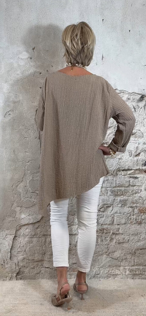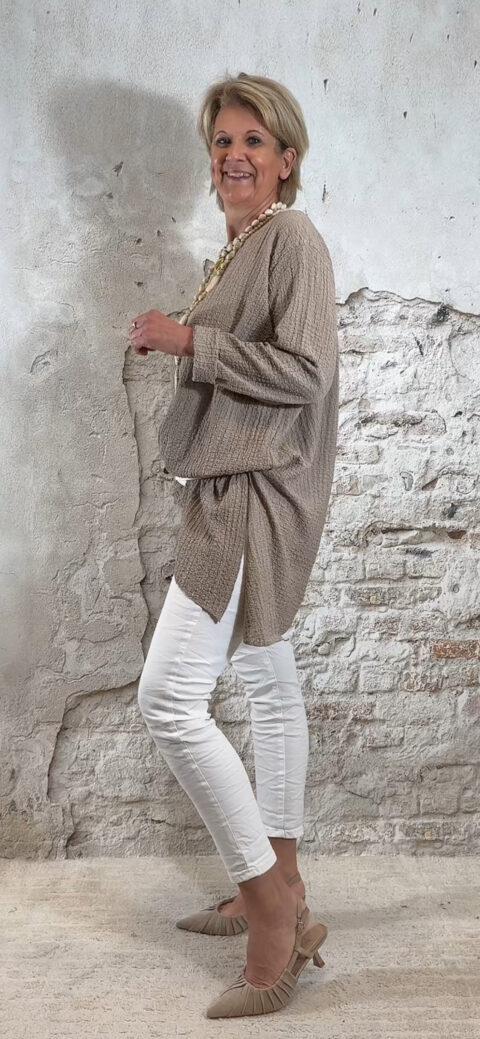 Het Indy oversized viscose mousseline asy shirt in taupe is een nonchalant en stijlvol item met een speelse asymmetrische vorm. Het ruimvallende model geeft een relaxte uitstraling en past perfect binnen een casual chic of Ibiza stijl.