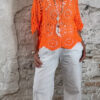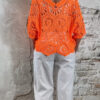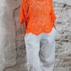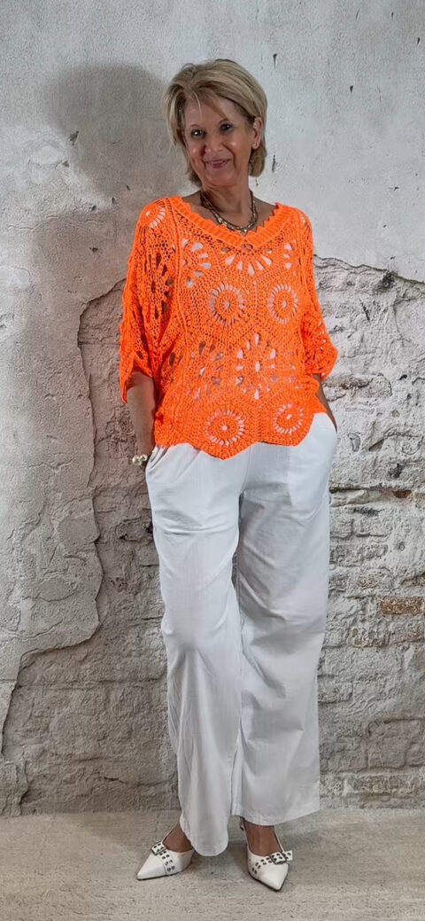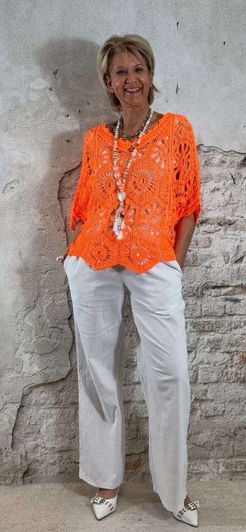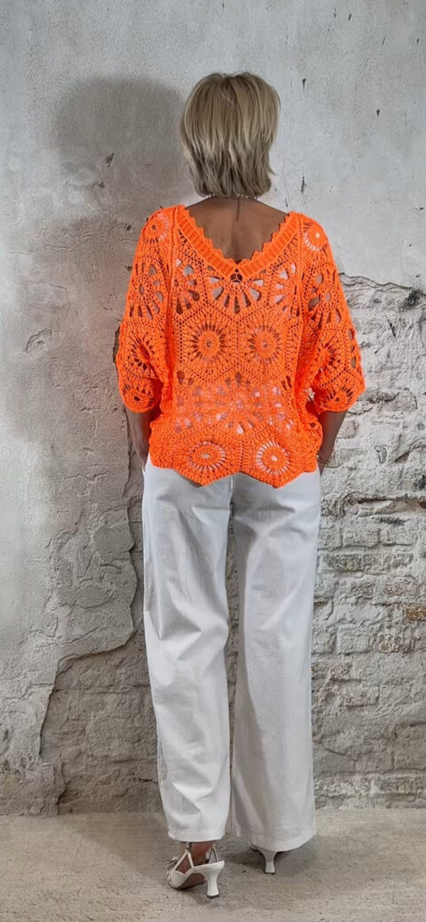 De top heeft een V-hals met een subtiel schulp randje voor een verfijnde afwerking. Ook aan de achterkant is een V-hals verwerkt, wat zorgt voor een elegante en open look. De mouwen vallen tot aan de elleboog en het gehaakte patroon geeft de top een luchtige, handgemaakte uitstraling.