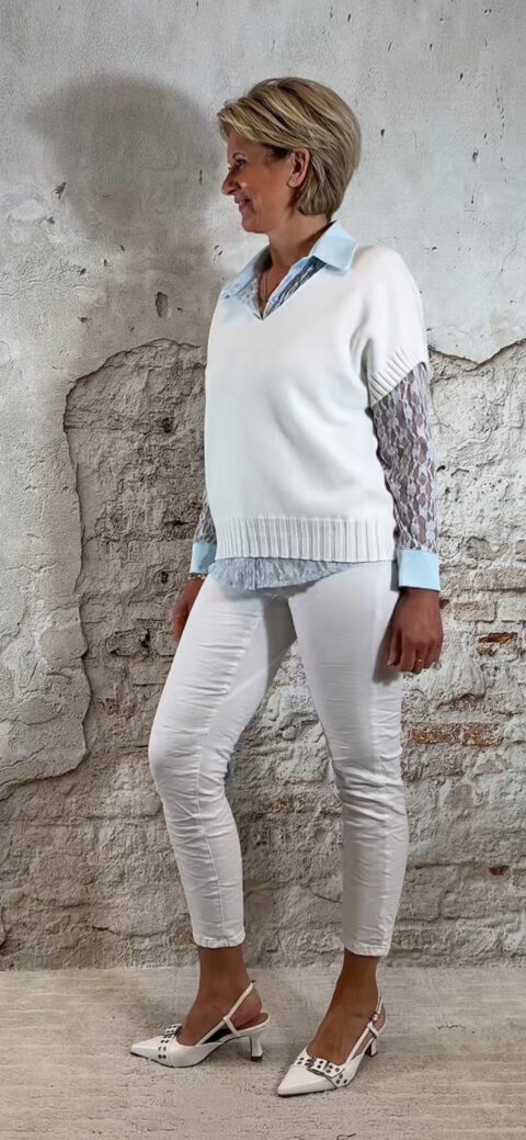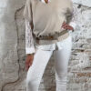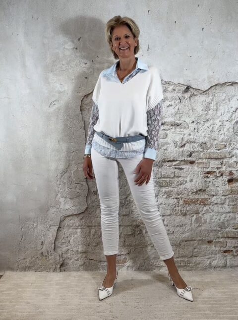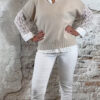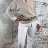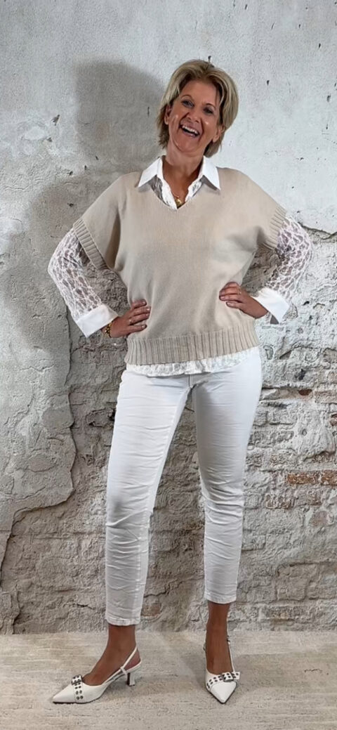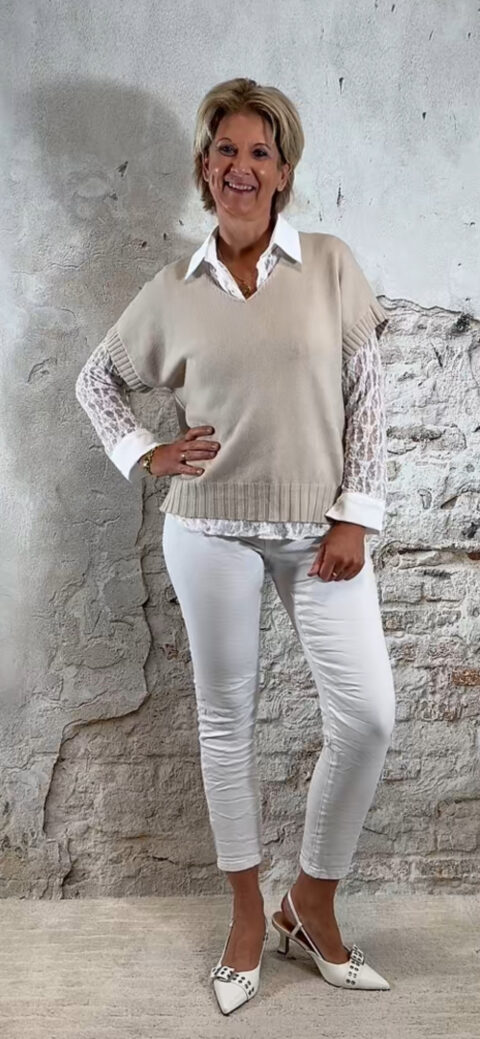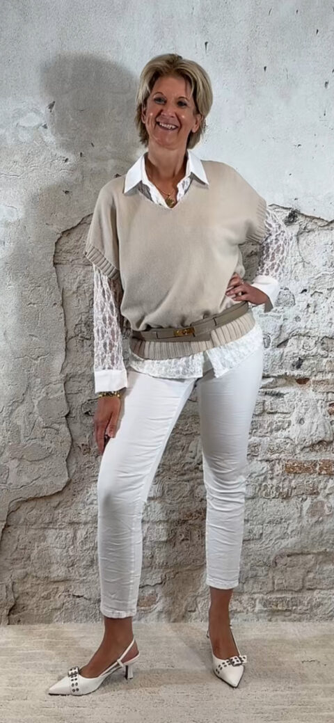 Kleuren: taupe/bruin, khaki, zand, beige, donkerblauw, ecru, wit en licht grijze jeans.