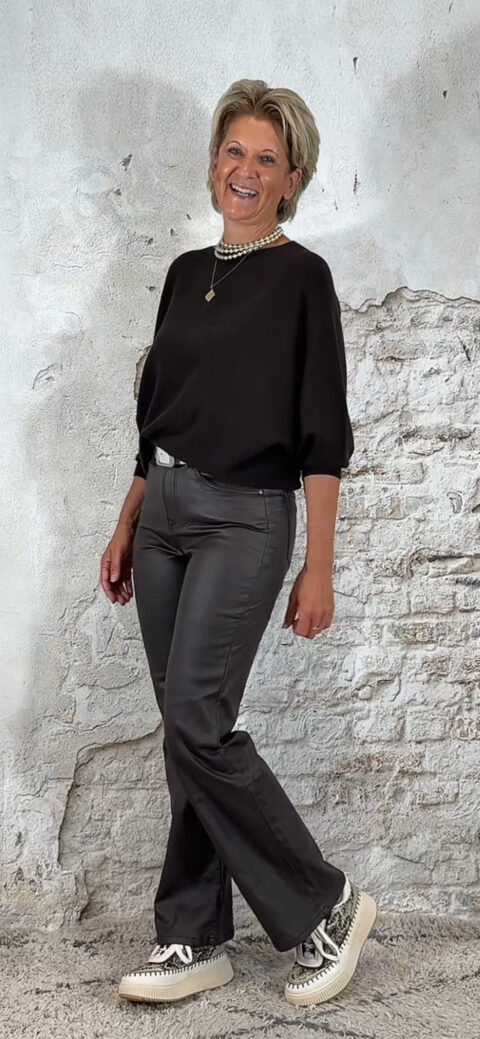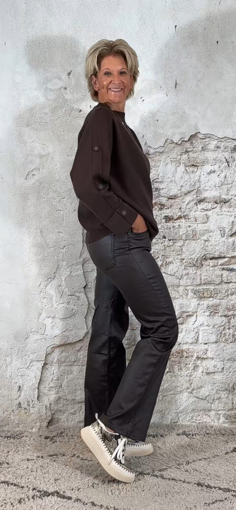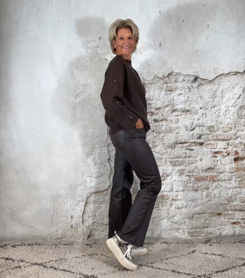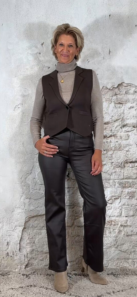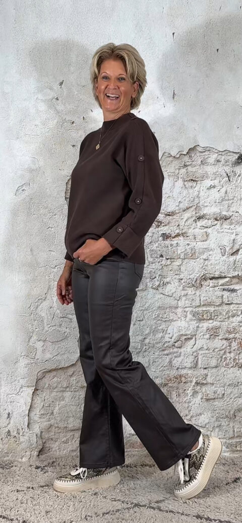 De Leatherlook bootcut jeans in bruin combineert een stoere uitstraling met ultiem draagcomfort.