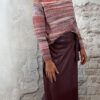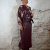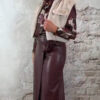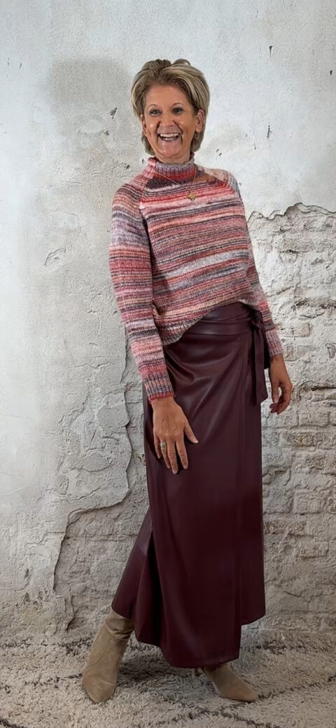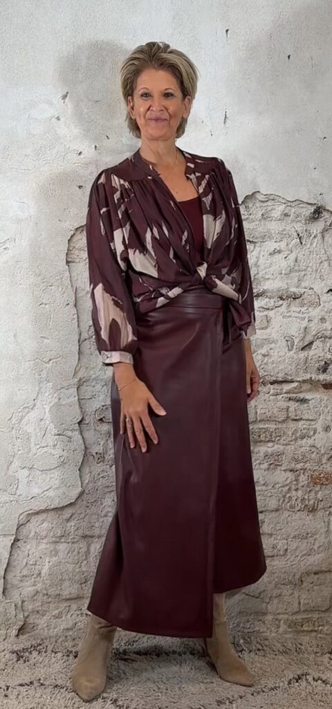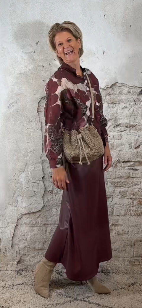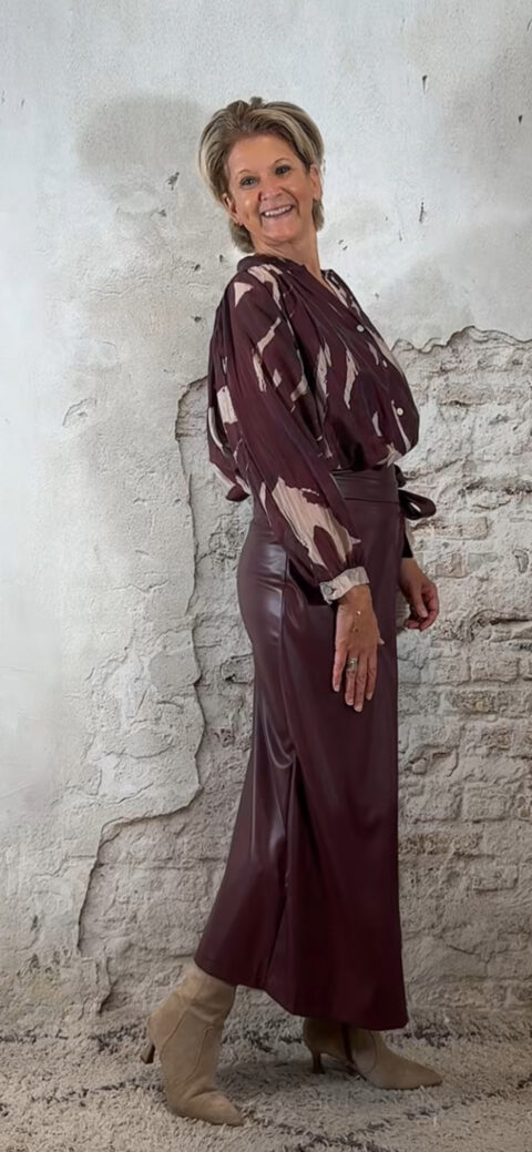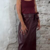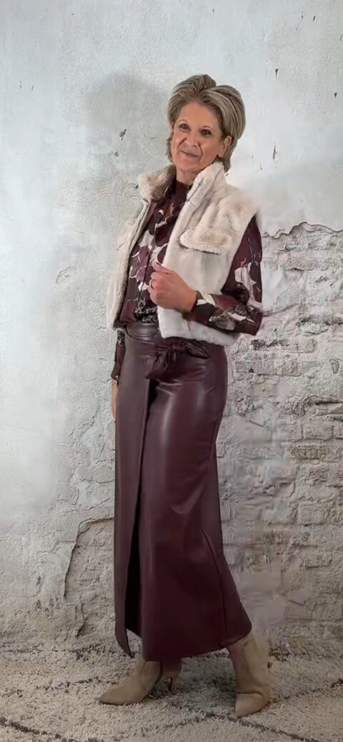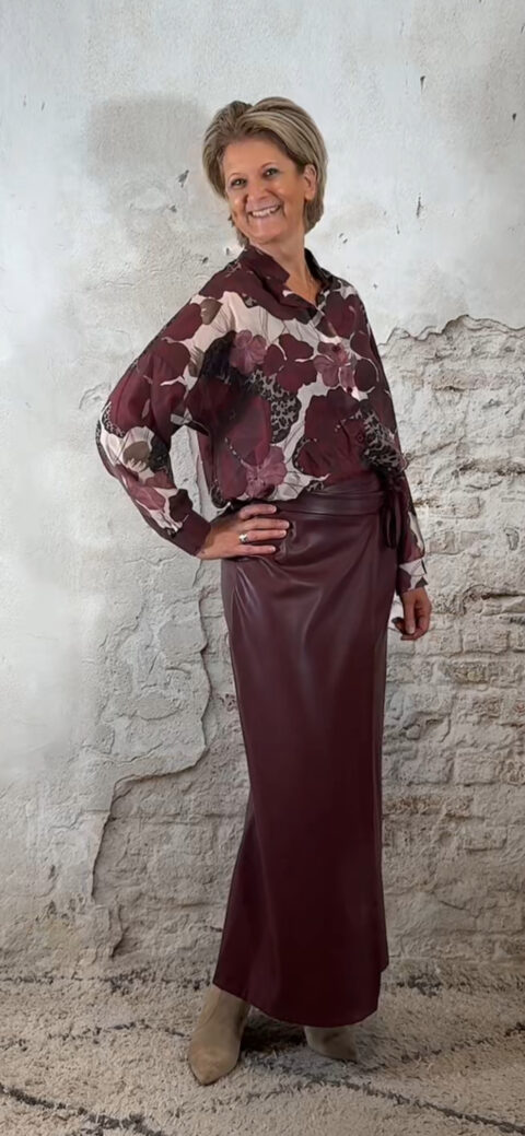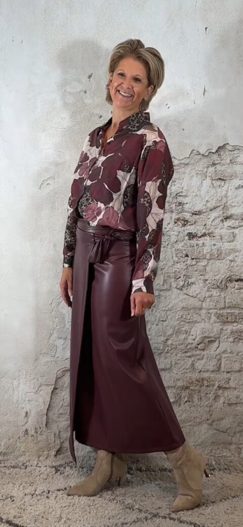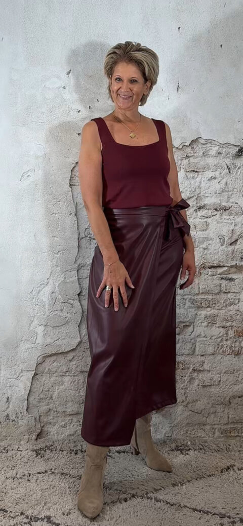 De Evy leatherlook maxi rok in bordeaux is een stijlvolle en vrouwelijke rok met een stoere twist. Het model lijkt een overslagrok, maar is volledig dichtgestikt – zo valt hij nooit open, ook niet wanneer je gaat zitten of bij een stevige wind. De strik aan de overslaglap geeft een speels detail en accentueert de taille.