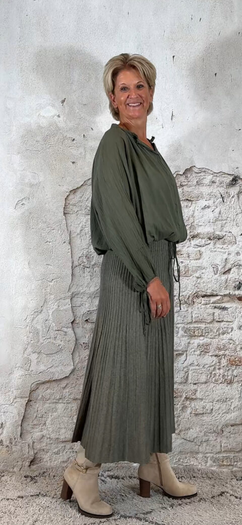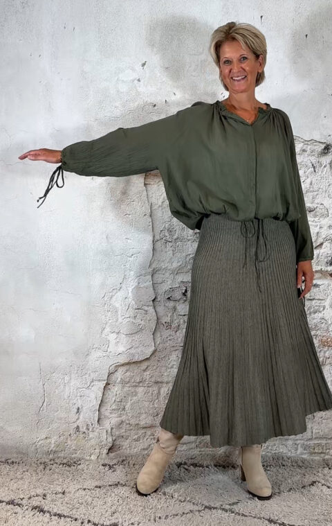 De blouse heeft koordjes in de mouwen waarmee je zelf de strakheid kunt bepalen en een koord onderaan om de blouse te laten bloezen. Hierdoor kun je hem dragen zoals jij wilt – los en luchtig of juist iets meer getailleerd.