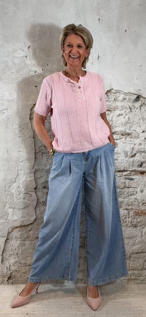 Het truitje heeft een knoopsluiting aan de voorkant en korte mouwen, waardoor je hem zowel dicht als open kunt dragen. De verticale ribbels zijn subtiel ingebreid en zorgen voor een mooi slank effect.