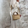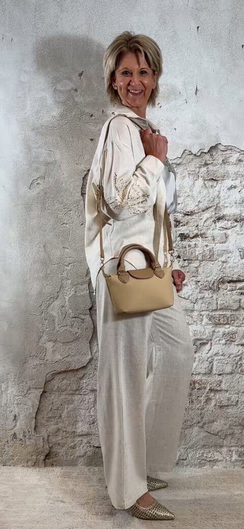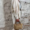 De hengsels, het klepje, de onderkant en de schouderriem zijn gemaakt van eco leather, terwijl de tas zelf bestaat uit een geweven stof met linnenlook. Dit geeft een mooie combinatie van stevig en zomers.