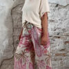 Luchtige linnenlook broek met roze ibiza print en elastische tailleband.
