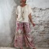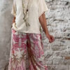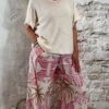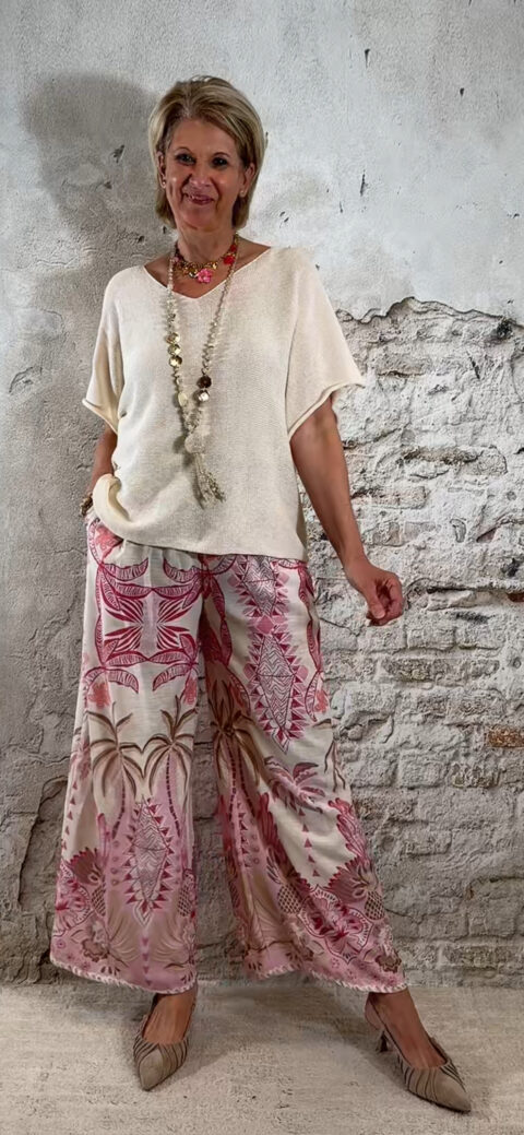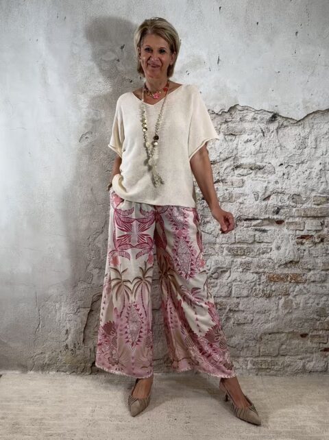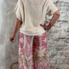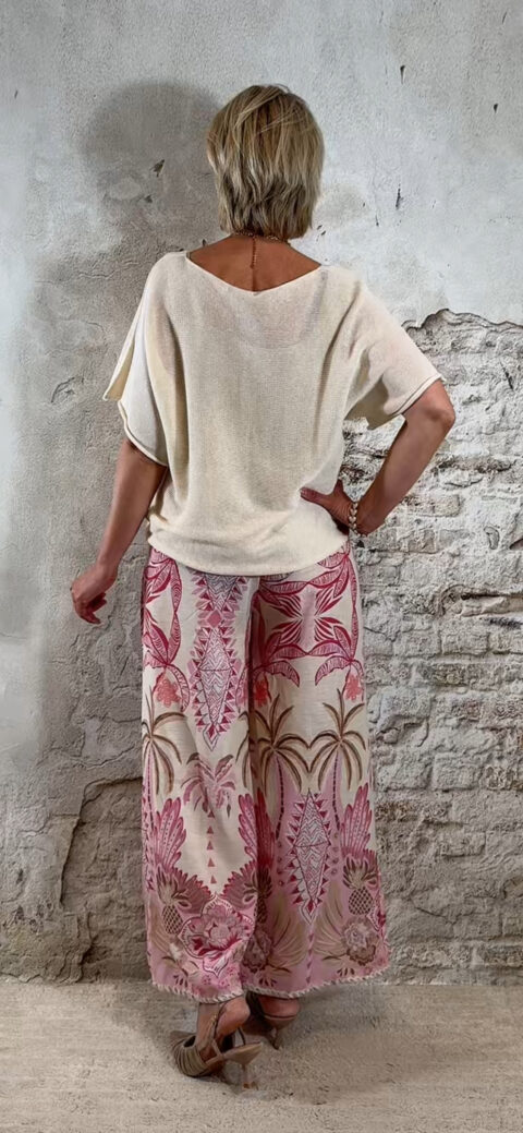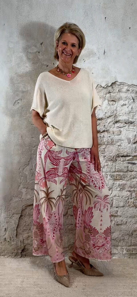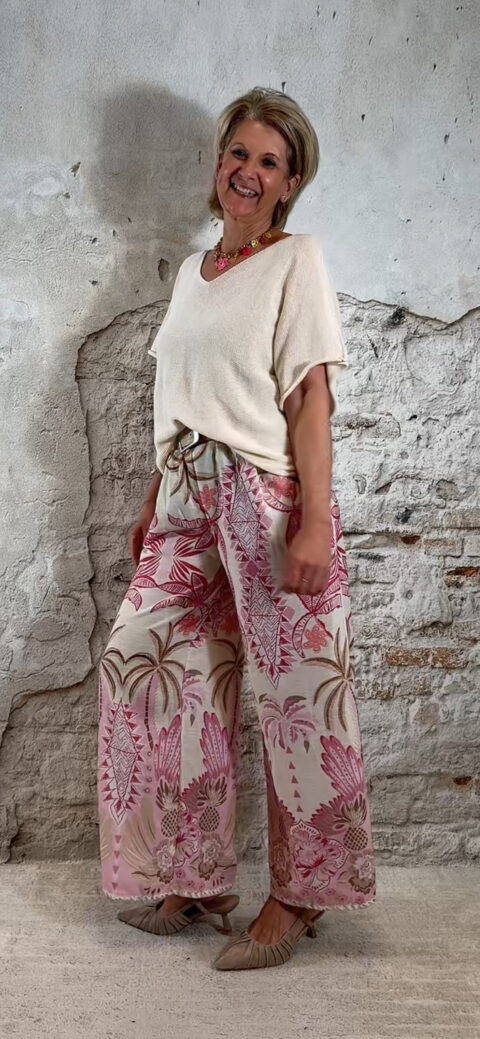 Deze linnenlook wijde broek voor dames in crème met een roze ibiza print en subtiele camel tinten is een heerlijke zomerbroek met een frisse en vrouwelijke uitstraling.