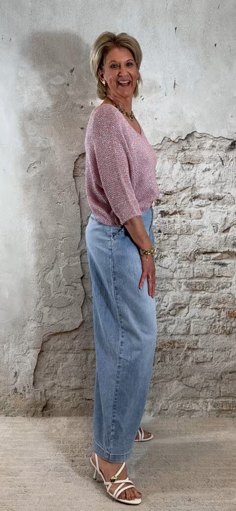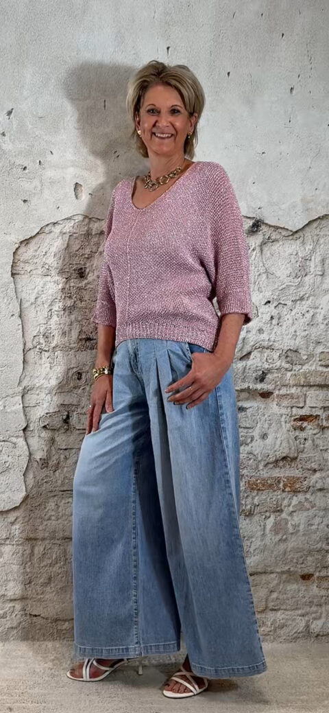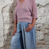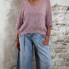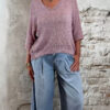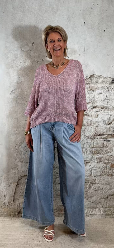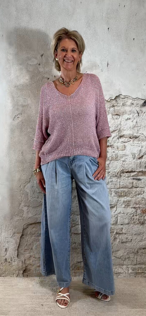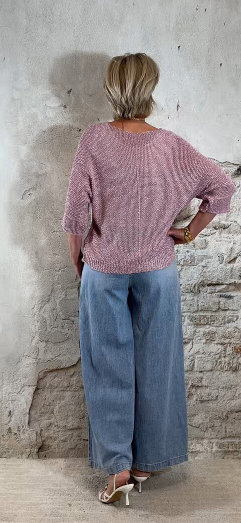 Luchtige vlindertrui met lurex en v-hals in lila/roze.