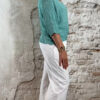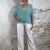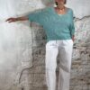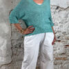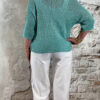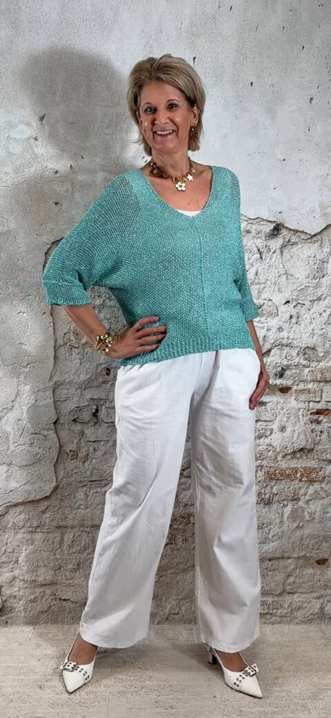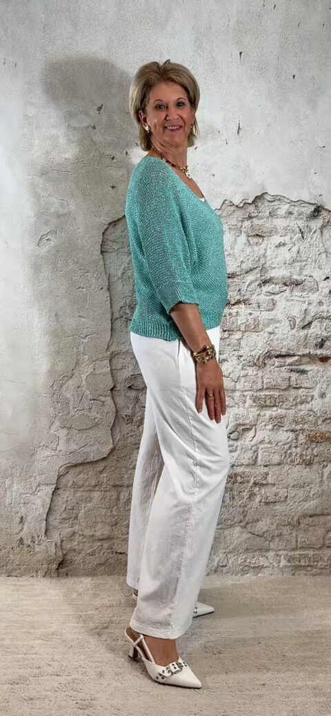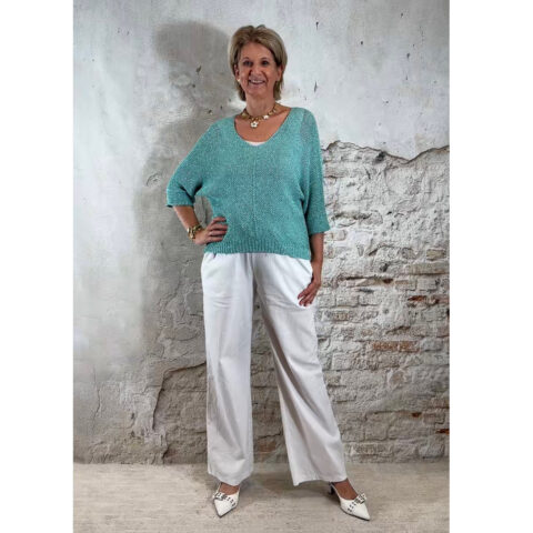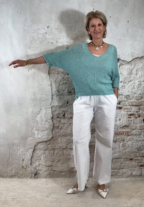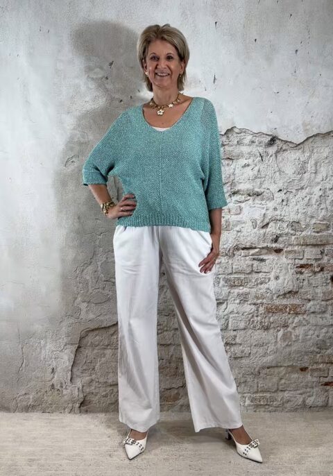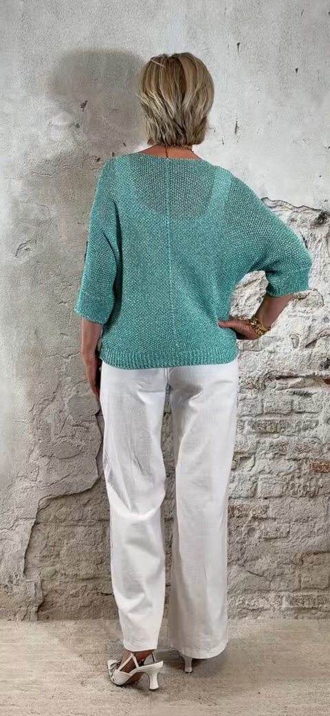Deze lurex vlindertrui voor dames in turquoise is een luchtig en vrouwelijk item met een subtiele sparkle. De korrelsteek geeft de trui een mooie structuur en zorgt voor een speels effect.