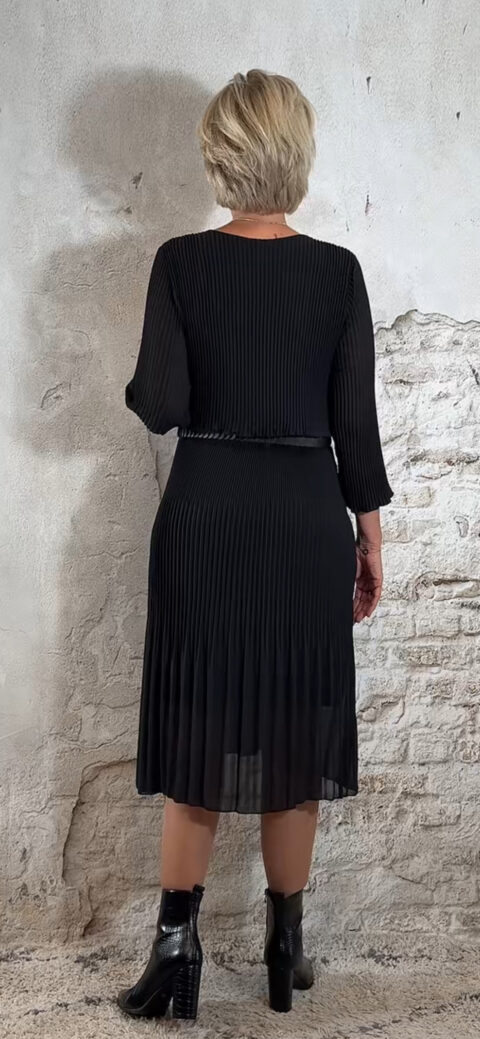 Mara Plissé Jurk Zwart – one size (36–42), elastische taille, gevoerd, plissé mouw, feestelijk en elegant.