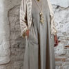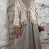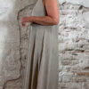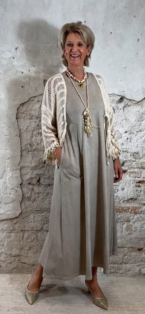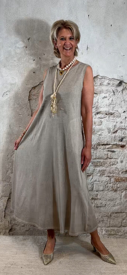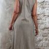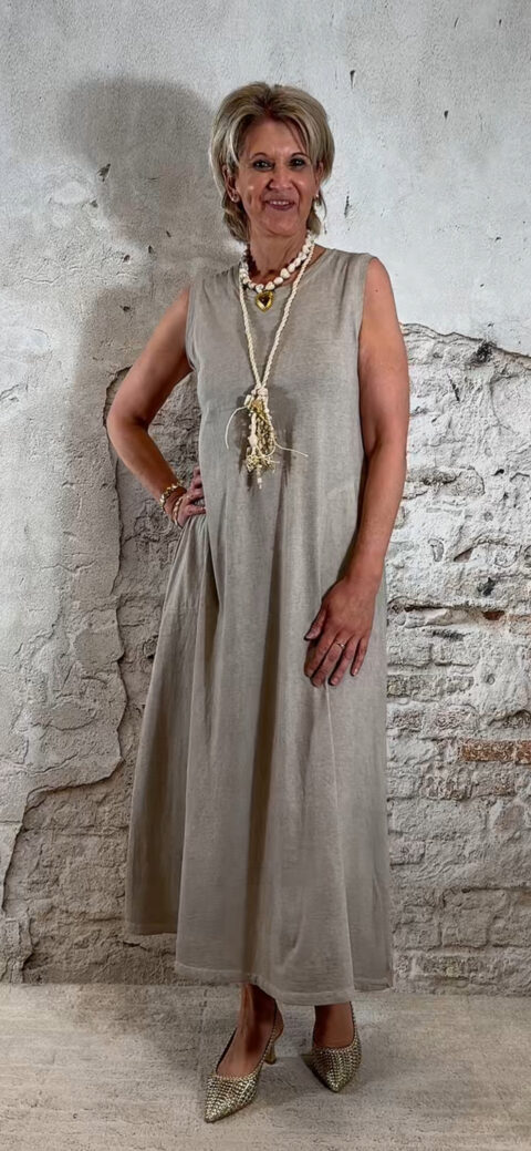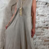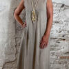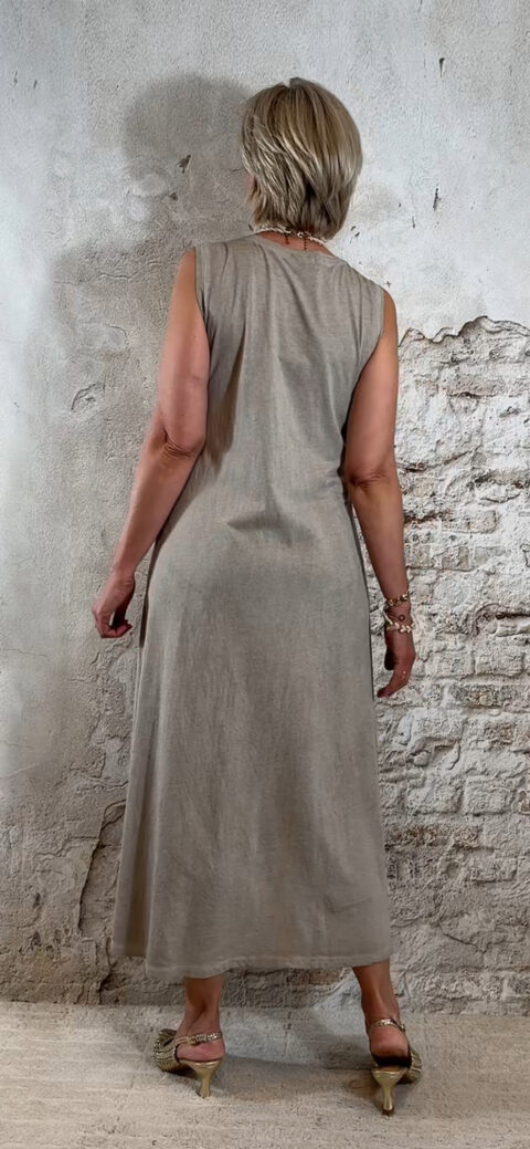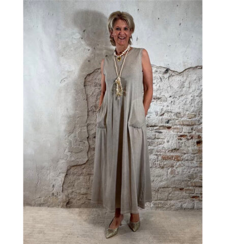De jurk valt lang en soepel langs het lichaam en heeft een relaxte pasvorm. Voorzien van zakken, wat hem niet alleen mooi maar ook praktisch maakt.