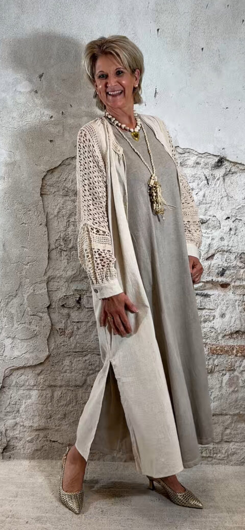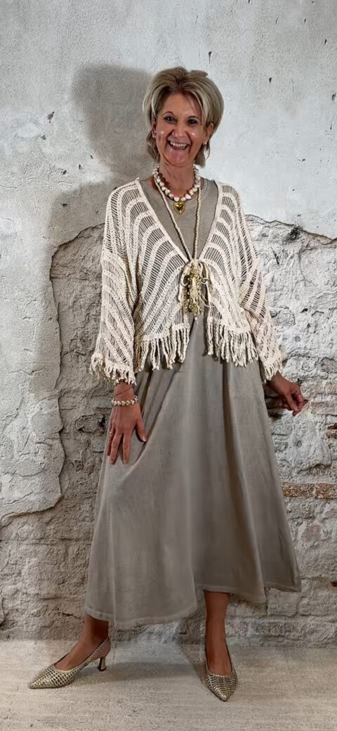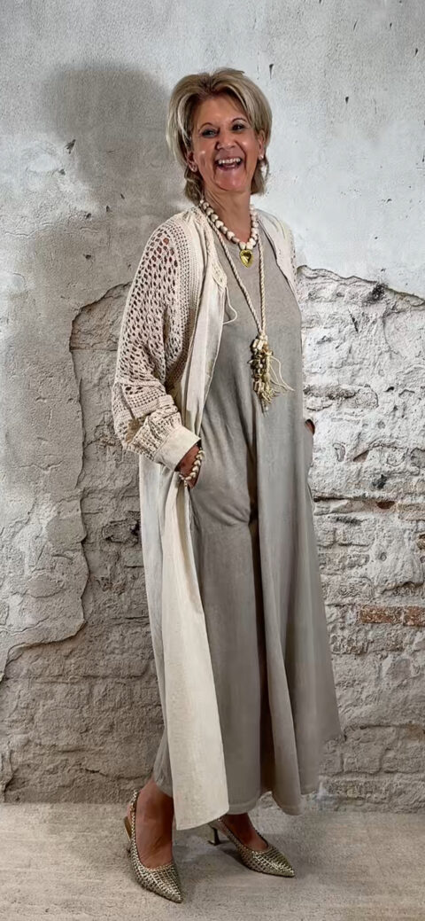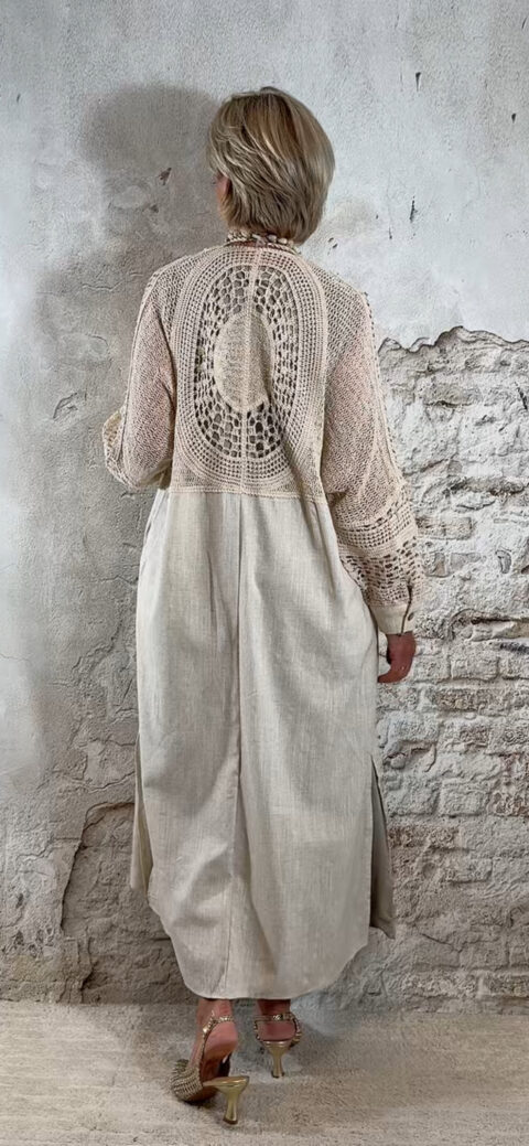 De katoenen stof voelt luchtig en prettig aan op de huid, ideaal voor warmere dagen. Combineer hem met een lang gehaakt vest voor een complete en speelse dames outfit.
