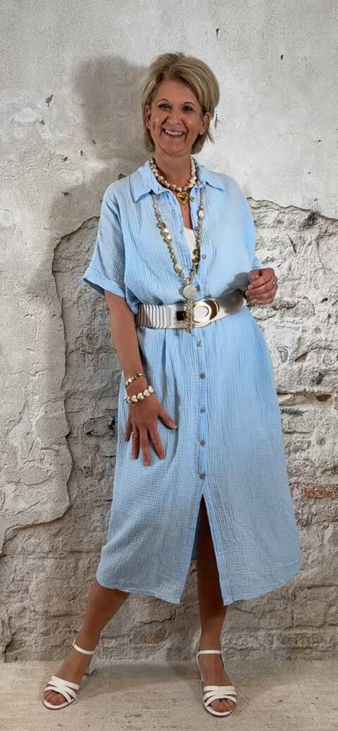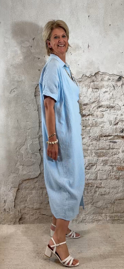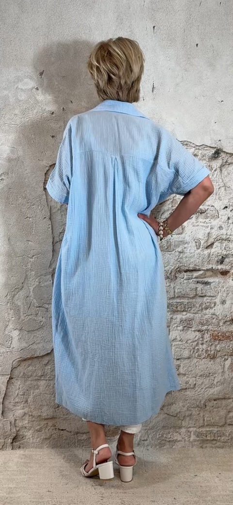 Mousseline katoen is een zachte en luchtige stof die prettig draagt op de huid. Het materiaal ademt goed en voelt licht aan, waardoor het ideaal is voor warmere dagen.