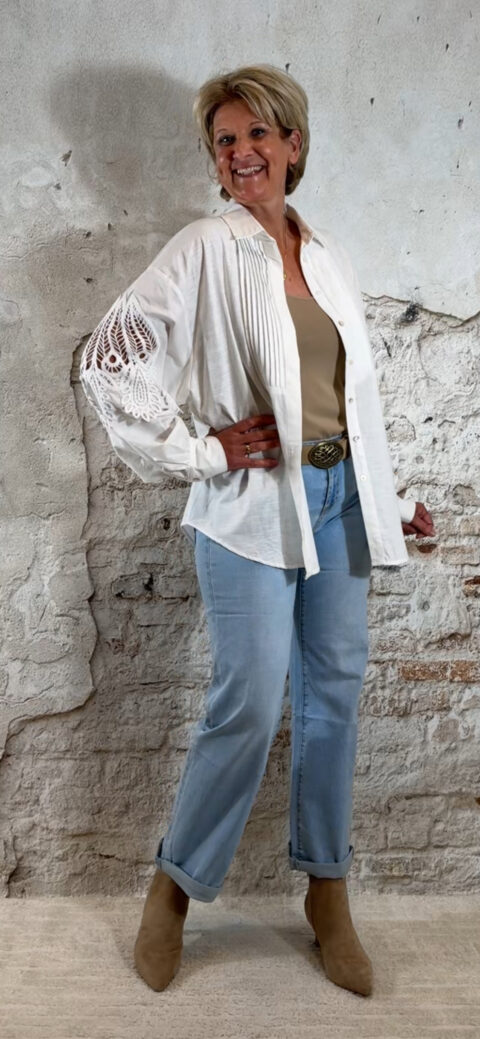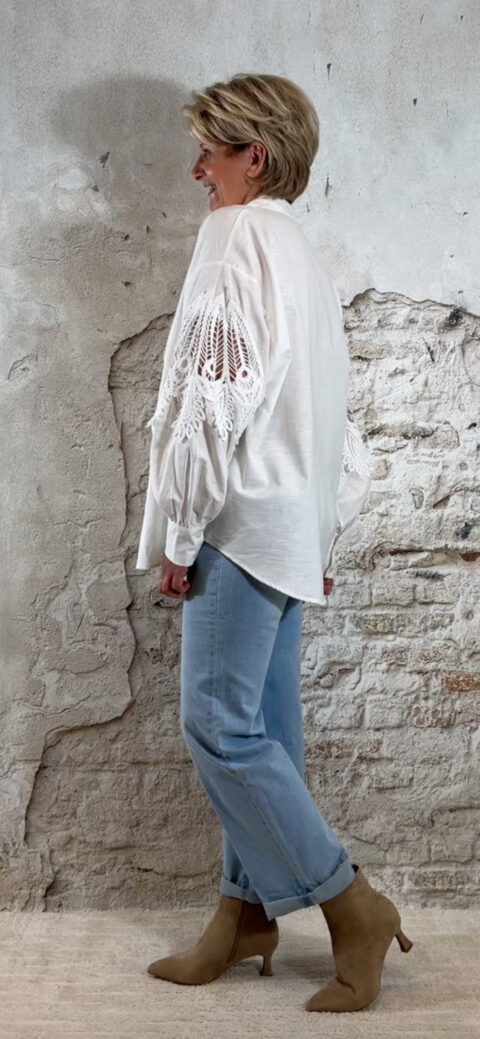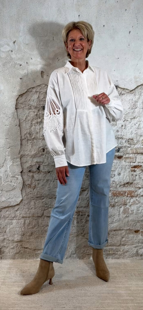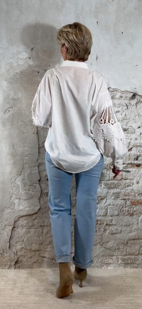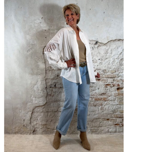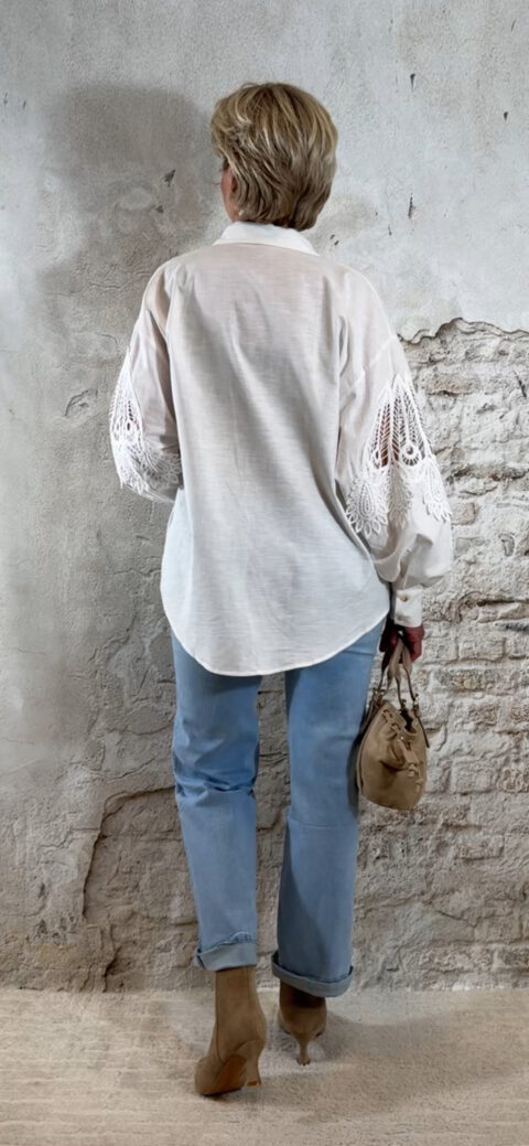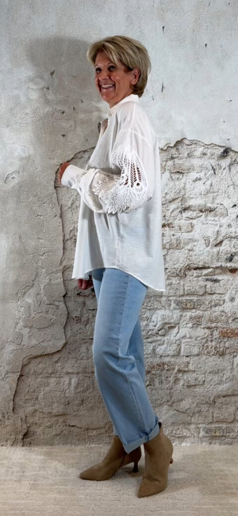 De Nana oversized blouse met kanten mouw is een luchtige, vrouwelijke blouse met een mooie mix van stoer en verfijnd. Het wijdvallende model draagt heerlijk comfortabel en valt soepel over het lichaam. De opengewerkte kanten mouwen geven de blouse een elegante uitstraling en maken dit item echt bijzonder.