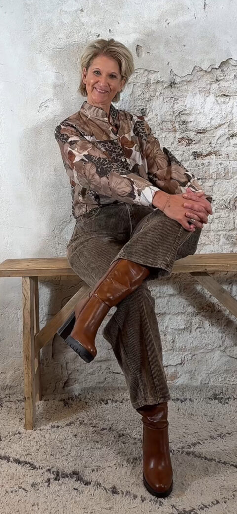 Zonder stretch, valt één maat groter. Verkrijgbaar in khaki, roze, camel, beige en bruin.