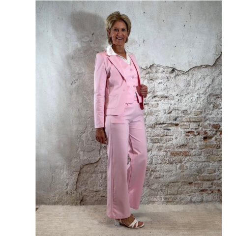 De blazer heeft een klassieke reverkraag, twee knopen aan de voorkant en steekzakken voor een verzorgde afwerking. De lichtroze kleur geeft je outfit een zachte, elegante touch en is prachtig te combineren met de bijpassende pantalon of gilet.