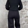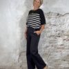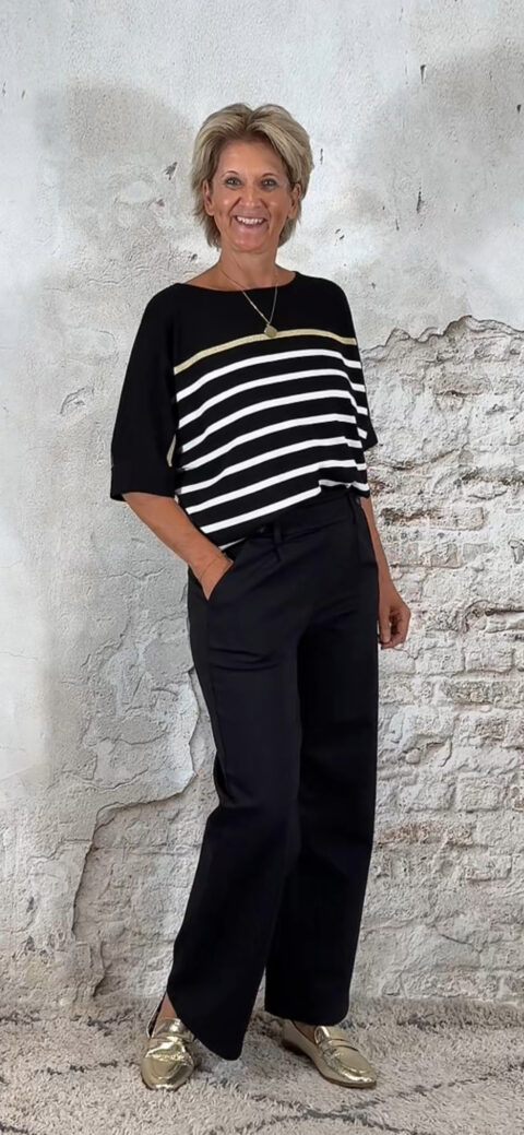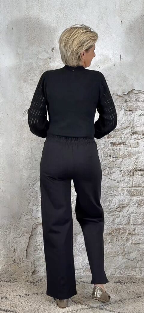 Het materiaal is een visocosemix met veel stretch en voelt glad aan waardoor het net zo fijn draagt als travelstof. De broek heeft aan de voorkant 2 sierknopen en aan beide kanten een klein bandplooitje en steekzakken, achter zit een elastische tailleband. De broek valt goed op maat.