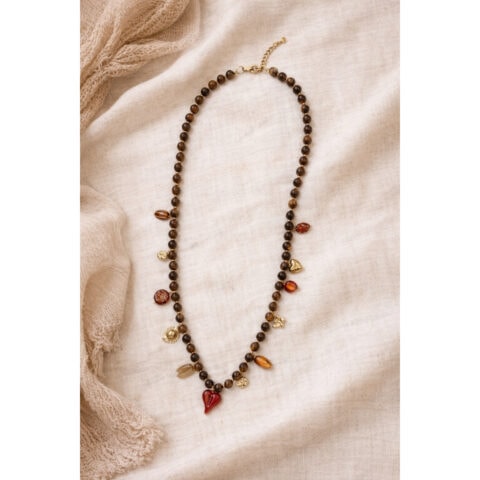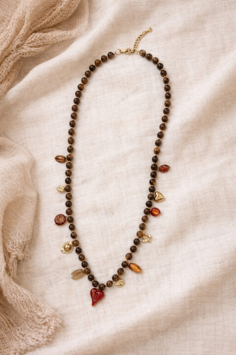 De combinatie van verschillende kralen en natuurstenen geeft elke ketting een unieke uitstraling en zorgt voor een speels en handgemaakt effect.