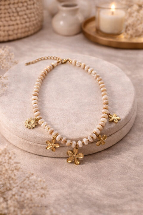 De ketting is afgewerkt met vijf gouden bedeltjes in de vorm van bloemen, die mooi verdeeld zijn over de ketting en zorgen voor een speels en opvallend detail.