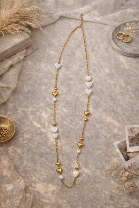 De Sil lange ketting hearts is vrouwelijk, speels en geeft je outfit direct een stijlvolle touch. De goudkleurige ketting is verrijkt met gouden hartjes bedels en beige marmerlook hartjes kralen, wat zorgt voor een zachte maar opvallende uitstraling.