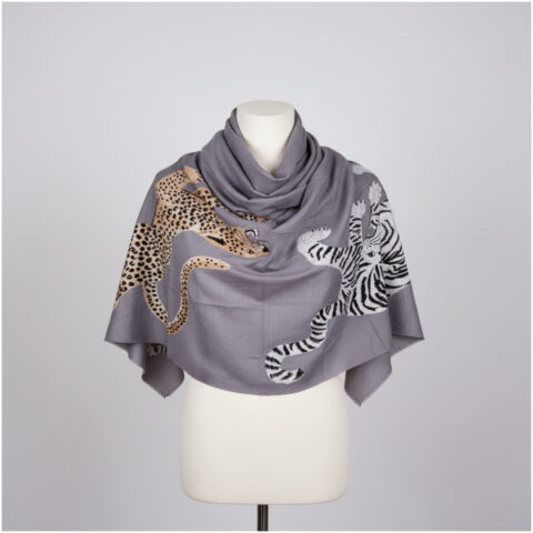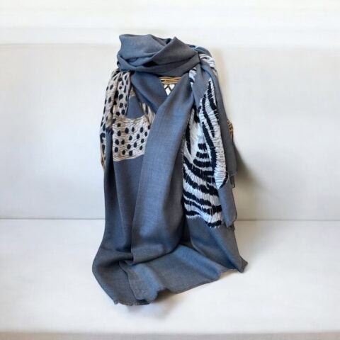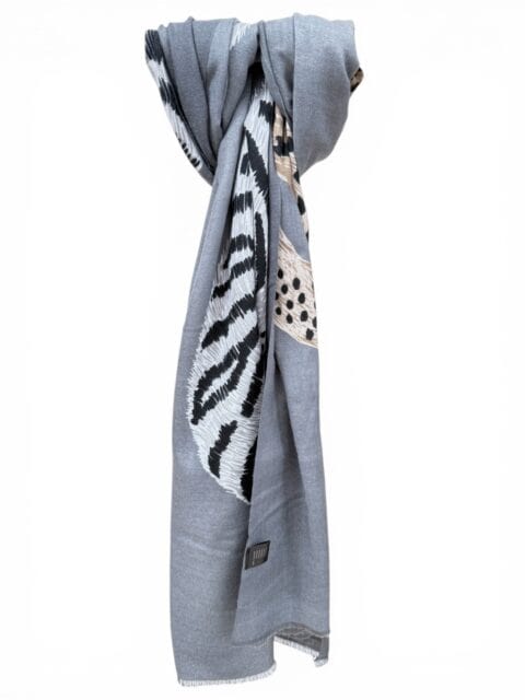 De Sjaal Coco Safari in grijs is een stijlvolle accessoire met een subtiele safari-print. De zachte mix van viscose en wol voelt comfortabel aan en geeft warmte zonder zwaar aan te voelen.