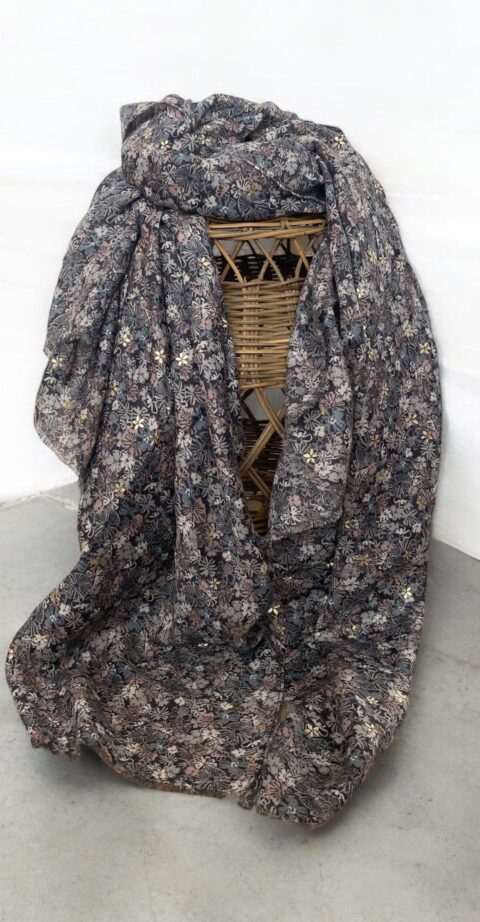 De Sjaal Daisy in grijs/jeansblauw/roze geeft elke outfit een frisse en vrouwelijke touch. Het bloemenpatroon wordt subtiel aangevuld met een sprankelend goud detail, waardoor de sjaal net dat beetje extra krijgt.