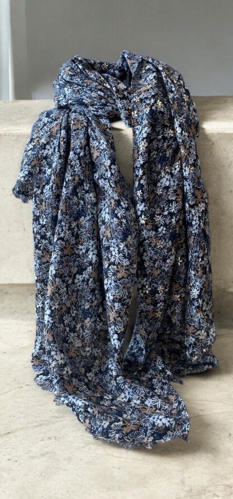 De Sjaal daisy in zwart/camel/blauw  geeft elke outfit een frisse en vrouwelijke touch. Het bloemenpatroon wordt subtiel aangevuld met een sprankelend goud detail, waardoor de sjaal net dat beetje extra krijgt.