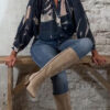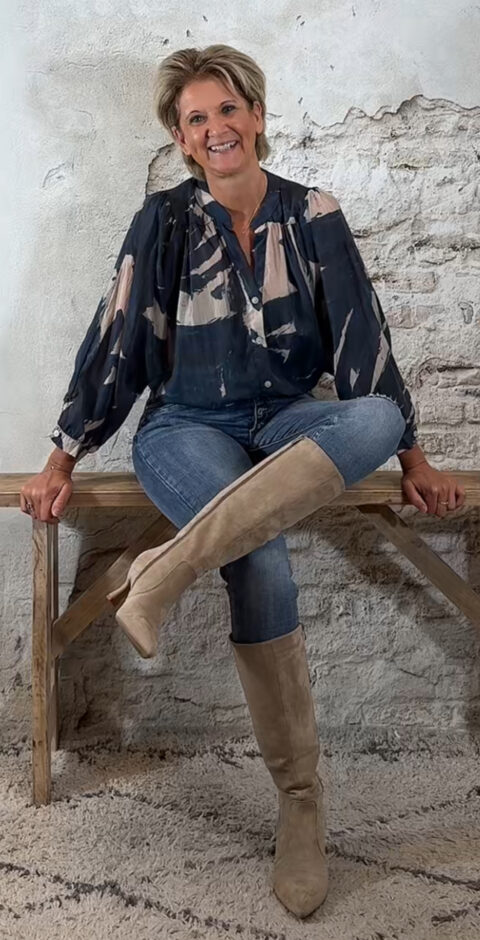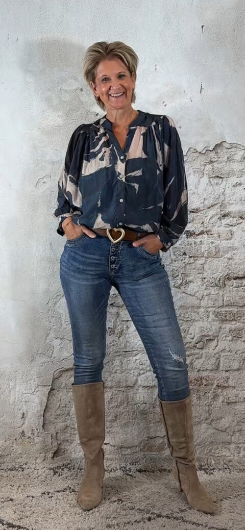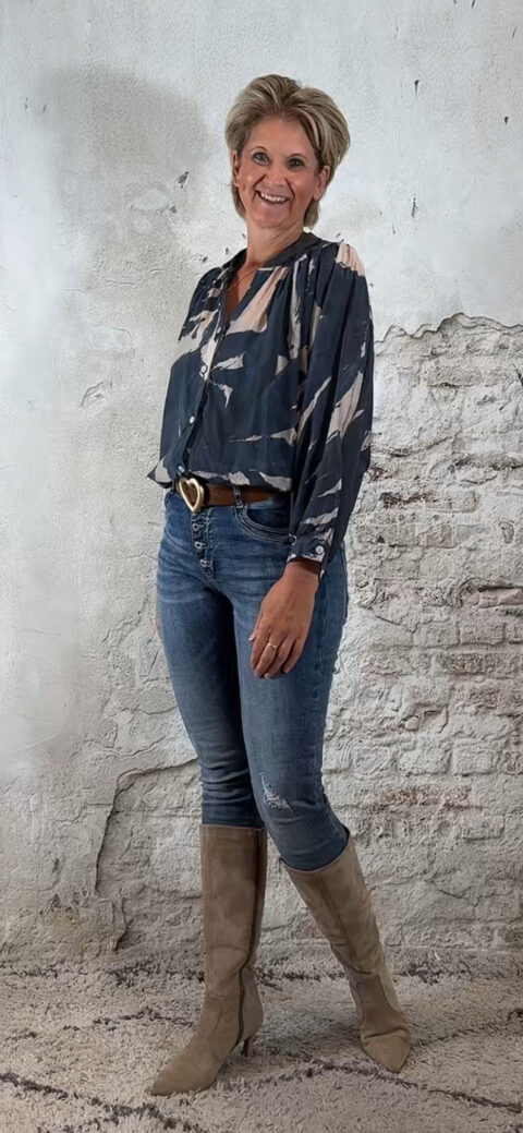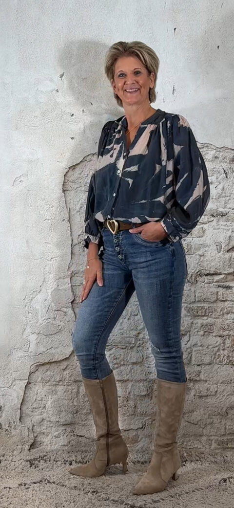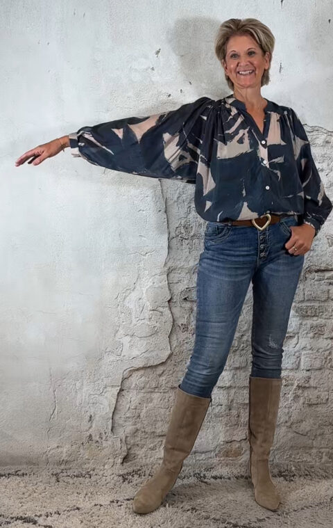 Evy vlinderblouse met print in 4 kleuren: donkerblauw, bordeaux, khaki en bruin. Oversized model met wijde mouwen, aangesloten manchetten en aangerimpeld pasje. One size, draagbaar van maat 38 t/m 42/44.