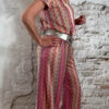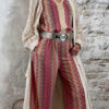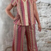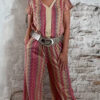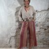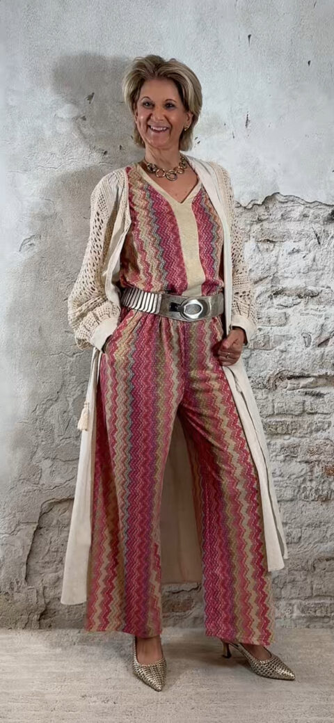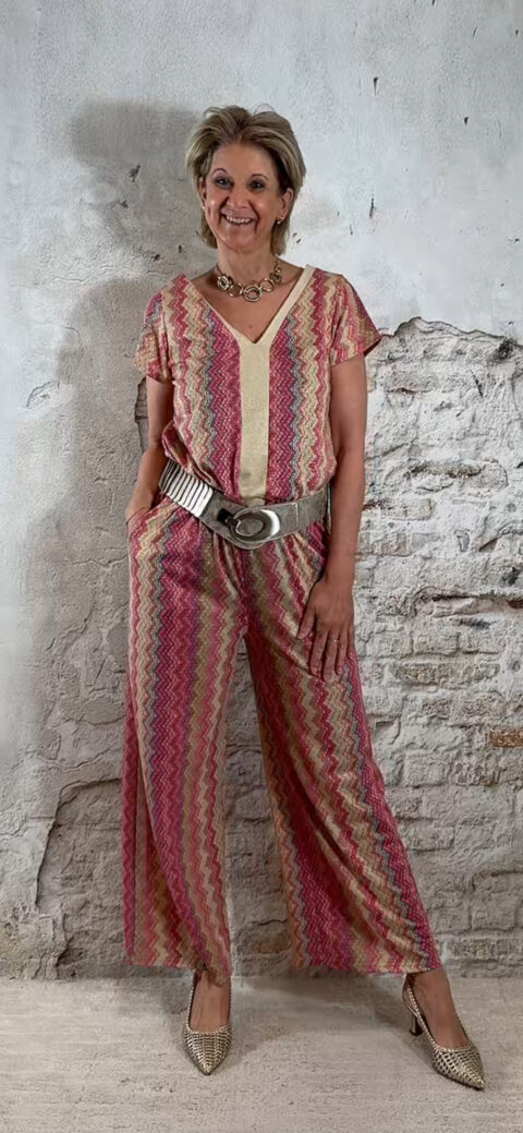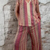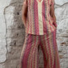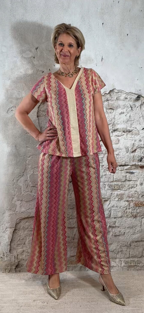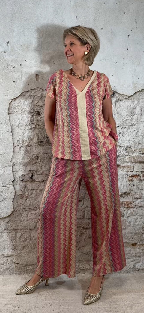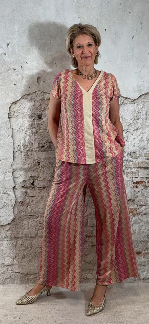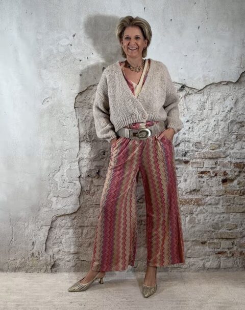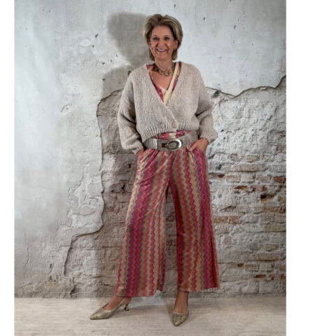 Deze dun gebreide wijde broek voor dames met Inka zigzag print in roze is een stijlvolle en comfortabele musthave. Het subtiele gouden lurex draadje geeft een mooie glans, zonder dat het kriebelt.