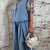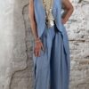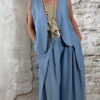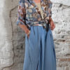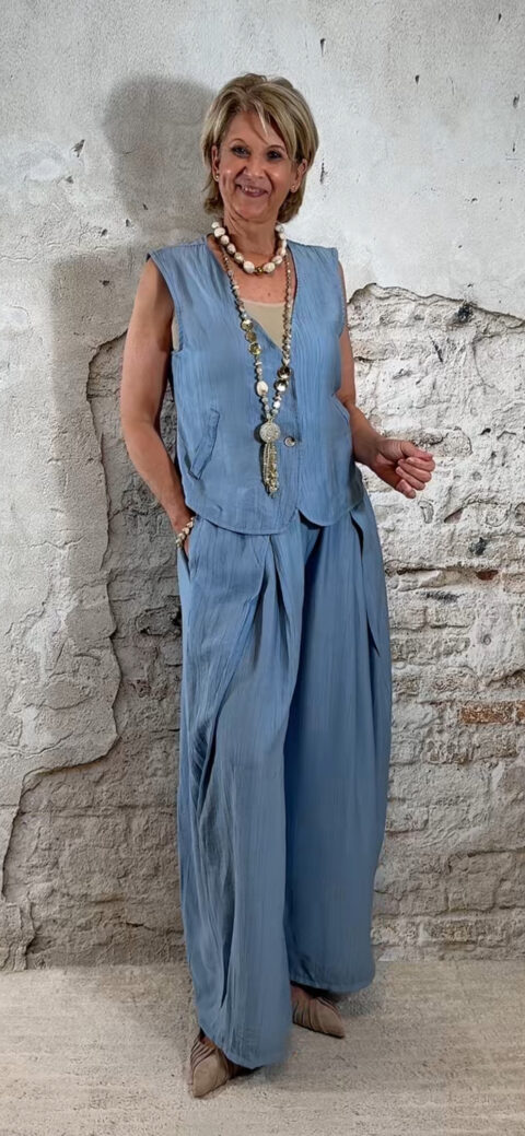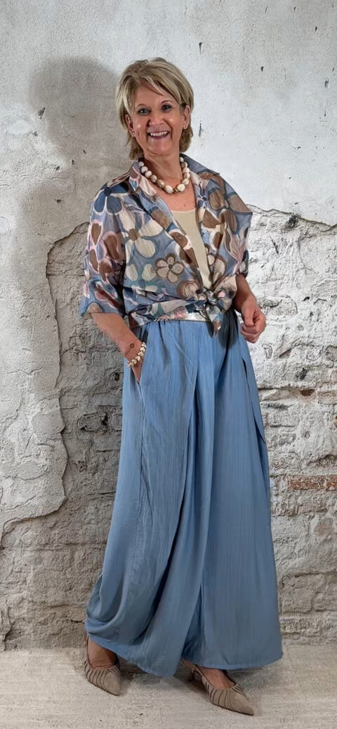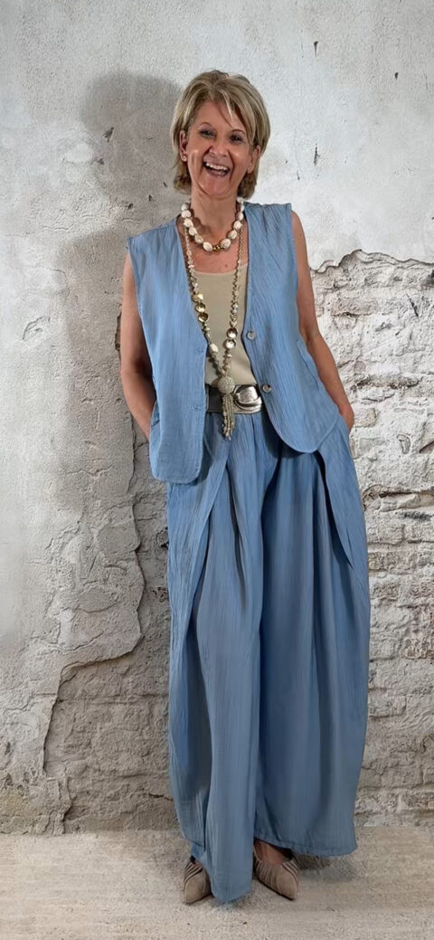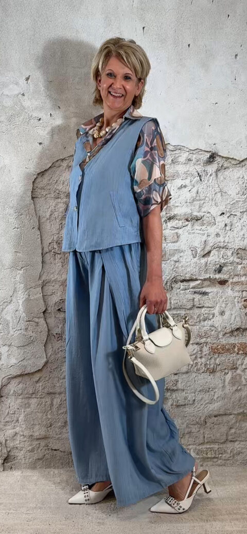 Perfect te combineren met het bijpassende gilet voor een complete set, maar ook prachtig met de zijde-look bloemenblouse waarin dezelfde jeansblauwe tint terugkomt.