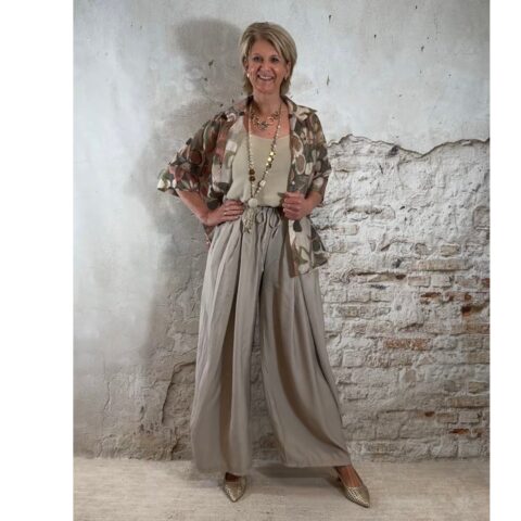 Deze wijde crêpe broek voor dames in een zachte zandkleur is een tijdloze musthave voor je garderobe. De subtiele overslag, verwerkt als bandplooi, geeft de broek een speels en uniek detail zonder dat het te opvallend wordt.