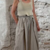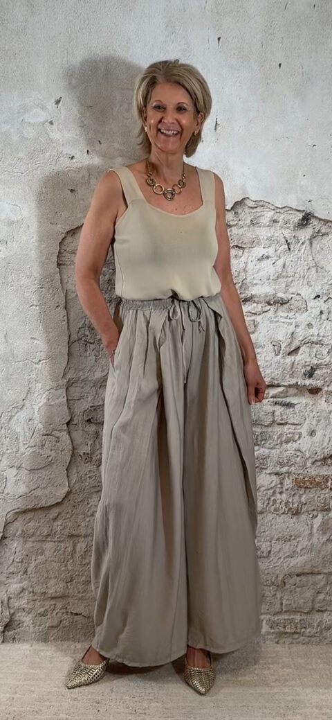 Wijde crêpe broek in zandkleur met subtiele overslag en elastische tailleband.