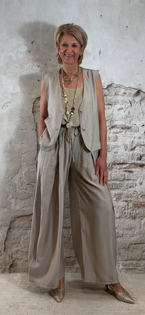 • Crêpe gilet dames zandkleur hoe valt en styling